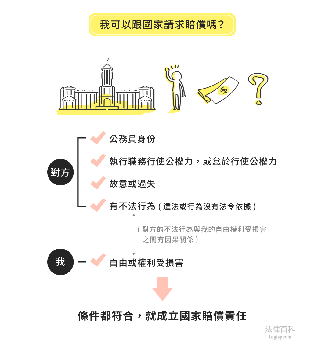 所有文章 / 基本人權‧政府 / 國家賠償 什麼情況下會成立國家賠償責任?第一種:公務員不法的侵害 國家賠償 公務員 公權力 怠於執行職務 國賠 文:蘇宏杰(認證法律人) 刊登於 2019-10-04 最後更新於 2022-12-23 在我國,要成立國家賠償責任的話,有兩種情況:第一種是因為公務員不法的侵害行為,另一種則是因為公共設施的瑕疵。 依國家賠償法第2條第2項規定,如果公務員執行職務行使公權力或怠於執行職務,因故意或過失,不法侵害人民自由或權利致生損害,國家應對人民負損害賠償責任[1]。以下分段說明本項國家賠償責任成立需要同時符合的要件[2]。(見圖1) 圖1 我可以跟國家請求賠償嗎? 資料來源:蘇宏杰 / 繪圖:Yen 一、身分上必須是公務員 國家賠償法規定的公務員,是指依法令從事於公務的人員[3],此為最廣義的公務員,不論文職或武職、國家或地方自治團體的公務員、公營事業機關的服務人員,也不論為編制內或編制外、臨時人員或聘僱人員,均屬國家賠償法的公務員[4]。 再者,如果是受委託行使公權力的私人團體,該團體的人員在執行職務行使公權力時,或是受委託行使公權力的個人,在執行職務行使公權力時,都視同委託機關的公務員[5]。 二、必須是執行職務行使公權力,或怠於執行職務的行為 (一)執行職務行使公權力 1. 執行職務的行為 所謂執行職務,是指公務員行使其職務上的權力或履行其職務上的義務等,而與其所負責的公務有關的行為,也就是,如果公務員的行為與其職務間,在外觀上、時間上或處所上相關連,且行為的目的與其職務作用間,內部上存有密切關連,都屬於執行職務[6]。 例如:輔導長穿著軍服,駕駛自用車輛,執行經長官同意的士兵交接任務,與順道載運屆退士兵,縱使非其法定職務範圍內的公務,仍可能因為外觀上、時間上及處所上與原本執行的職務密切相關,而被認為在執行職務[7]。 2. 行使公權力的行為 所謂行使公權力,是指公務員立於國家機關的地位,行使統治權作用的行為,包括: (1)運用命令及強制等手段干預人民自由及權利的行為,以及 (2)提供給付、服務、救濟、照顧等方法,增進公共及社會成員的利益,以達成國家任務的行為。例如:環保局的垃圾車司機定時駕駛垃圾車到指定地點收集垃圾,仍可能被認為在行使公權力[8]。 (二)怠於執行職務 除前述積極地執行職務行使公權力的情形外,公務員的消極不作為,如果構成怠於執行職務,也可能符合國家賠償責任的要件。 此時對於執行職務的判斷,要回去看相關法律怎麼規定的,若法律規定的內容不只在授權國家機關推行公共事務,其目的還包括保護人民生命、身體及財產等,且法律對主管機關應執行職務行使公權力的事項規定明確,公務員依該法律規定,對可以特定的人負有作為義務,且已經沒有不作為的裁量餘地時(也就是只能選擇積極地有所作為,而沒有選擇消極地不作任何事情的空間時),公務員仍消極不作為,就會構成怠於執行職務[9]。 例如:公務員對餐廳未依法進行建築物的公共安全及消防設備的定期檢查及執行取締,可能構成怠於執行職務[10]。 三、必須有故意或過失 所謂故意,是指公務員對於構成不法侵害行為的事實,明知並有意使該事實發生,或預見該事實的發生,而其發生並不違背公務員的本意[11]。 所謂過失,是指公務員雖非故意,但按在當時的情況下其實應注意,並能注意,而不注意,或是指對於構成不法侵害行為的事實,雖已經預見該事實能發生,但還是確信該事實不會發生[12]。公務員應注意,並能注意之標準,是以忠於職守的一般公務員,在該具體情況應該能注意,並可期待其注意的程度而言[13]。 四、須為不法的行為 所謂不法,例如違反法律強制或禁止規定[14]、不依法律或命令明文規定的要件為行為,或行為無法律或命令的依據[15]等。 五、必須侵害人民的自由或權利致生損害 所謂自由或權利,依照憲法、法律、法規命令、自治條例等法規的規定決定[16]。因此,若是受該等規定保障的自由或權利受侵害,而生損害,即符合此項要件。 六、不法侵害人民自由或權利的行為與人民受損害間,必須有相當因果關係 有相當因果關係的情形,是指如果沒有此行為,必然不會發生此種損害,但有此行為,通常即足以發生此種損害;反之,沒有相當因果關係的情形,則是指如果沒有此行為,必然不會發生此種損害,縱然有此行為,通常亦不會發生此種損害[17]。 以上所述一至六的要件,是針對不「具審判或追訴職務公務員」(例如:法官、檢察官)的情形。 七、如果公務員是負責審判或追訴職務的公務員呢? 人民若是想要對負責審判或追訴職務公務員的作為或不作為,請求國家賠償的話,這類公務員除了必須: (一)因為執行職務侵害人民自由或權利,還必須 (二)對參與審判或追訴案件觸犯與其職務有關的犯罪(例如:枉法裁判罪[18]、濫權追訴罪[19]),且 (三)經法院判決有罪確定[20]。 上述是有關因為公務員的不法侵害,而成立國家賠償責任的情形。另外,如果是公共設施的瑕疵,也有可能成立國家賠償責任,關於這個部分,可見《什麼情況下會成立國家賠償責任?第二種:公共設施的瑕疵[21]》。