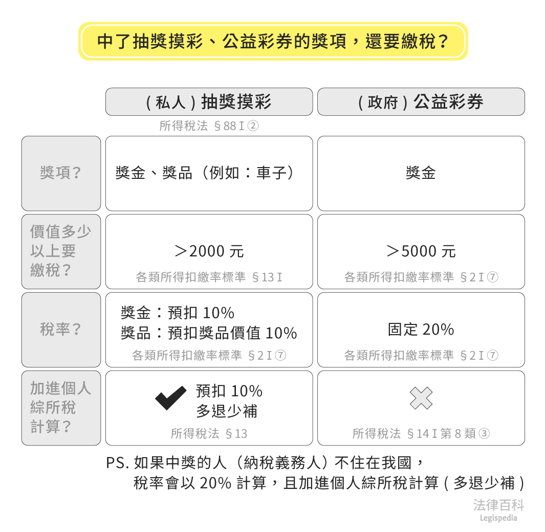 所有文章 / 基本人權‧政府 / 課稅 為什麼中獎也得繳稅?尾牙摸彩跟公益彩券要繳的稅金有什麼不同? 綜合所得稅 所得稅 獎金 彩券 刮刮樂 文:吳俊志(認證法律人) 刊登於 2021-05-07 最後更新於 2024-02-20 每個人都有一個發財夢,每次看到威力彩頭獎落空好幾次,彩券行門口就會開始大排長龍,大家想成為幸運兒。不過大家可得注意,有時新聞上看到的獨得10億,可不代表中獎人真的能拿到這麼多喔!(見圖1) 圖1 中了抽獎摸彩、公益彩券的獎項,還要繳稅? 資料來源:吳俊志 / 繪圖:Yen 一、尾牙摸彩也得課稅? 尾牙摸彩常常是上班族一年最期待的日子,當然重點不在尾牙吃什麼,而是公司的最大獎獎落誰家。不過要是你幸運中了最大獎,隔天公司會計就會提醒你記得繳稅,這時的大家通常都一臉困惑,尾牙摸彩中獎也得繳稅? (一)尾牙摸彩會先被課稅? 是的,你沒看錯,參加公司的尾牙摸彩,不管是中了10萬元獎金還是抽中賓士車,都要繳稅。按照所得稅法第88條第1項第2款的規定,「競賽或機會中獎之獎金或給與」[1]是必須扣繳的。白話來說就是拿到獎金之前,公司會先幫你把要繳的稅扣下來,先幫你繳給政府,目的當然是讓國家可以提早收到稅,確保中獎人不會領到大獎就跑路逃稅啦! 至於要扣繳多少呢?按照財政部公布的「各類所得扣繳率標準」第2條第1項第7款本文的規定[2],納稅義務人如果是在我國境內居住的自然人,或是在我國境內有固定營業場所的營利事業,競技、競賽或機會中獎的獎金需要扣繳10%[3]。所以尾牙中獎的話,公司會先幫你扣掉10%的稅金。例如尾牙抽中100萬,進到你戶頭的就只有90萬。另外提醒大家的是,這種私人舉辦的抽獎,獎金不到20000元是不用扣繳的喔[4]! (二)中獎會影響到當年度的所得嗎? 但中獎還有後續,所謂「扣繳」只是先幫你把稅扣起來,不代表在年度報稅的時候不用加入綜合所得總額一起算[5]。所以摸彩的獎金還是得加進去個人該年的綜合所得裡面計稅,也就是說如果你中了超級大獎,除了先被扣繳10%外,最後還是可能會因為綜合所得總額提高,而要在報綜合所得稅時被課以更高的稅率[6]。當然,如果年度所得加計獎金之後,稅率仍然不到10%,多扣的部分還是會退稅的。 (三)不是抽到獎金,而是抽到獎品,要怎麼課稅? 而尾牙抽獎除了現金大獎以外,還可能有搶手的PS5、剛上市的iPhone,甚至有些公司比較誇張的,還有抽汽車、甚至抽房子。這種時候大家拿到的獎品當然不可能自己少掉10%,所以公司通常會要求中獎的員工先提供獎品價值的10%當作扣繳稅款。雖然是一筆不小的開銷,但相比領到超級大獎,借錢來繳稅也划算吧? 二、公益彩券課稅大不同 那如果是中了樂透或是威力彩頭獎,獎金上億的情況呢?經過剛剛的介紹,大家可能會開始擔心,這樣綜合所得會不會一下子連跳好幾級,得適用40%的最高級距稅率呢[7]? 這點倒是不用擔心,政府辦的獎券,規定還是會有點不同。按照各類所得扣繳率標準的規定,政府舉辦的獎券是採用20%的固定稅率,獎金沒有超過5,000元就不用課稅,但只要一超過,政府就會自動幫你扣走全額獎金20%的稅款[8]。 這聽起來好像是壞消息啊?就算只中了5001元,稅率也不會比較低。但轉念一想,如果中的是超級大獎,這時卻也不用像私人辦的抽獎、摸彩一樣計入綜合所得總額。按照所得稅法第14條第1項第8類的規定[9],政府所舉辦的獎券,中獎獎金只要依照所得稅法第88條的規定扣繳稅款就好,不會再計入綜合所得總額裡面。至少大家就不用擔心加上10億元頭獎後,還得適用40%的最高稅率來計算該年度綜合所得的問題了。 三、結論 不管是尾牙抽中大獎,還是因為公益彩券一夕致富,都是可遇不可求的夢想。不論是高額獎金還是名車,都能讓大家興高采烈好一陣子。但可別忘記,獎金或獎品也是所得,也得繳稅,幾億的頭獎,國家也可以分一杯羹,如果是實物獎品,更要記得先籌錢繳納扣繳稅款才是。