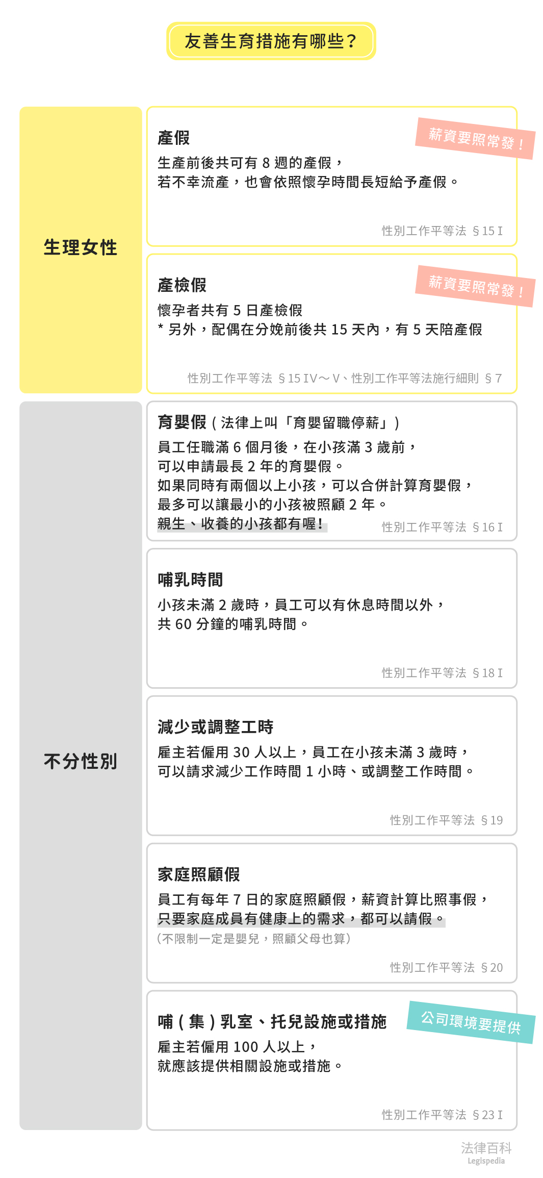 所有文章 / 勞動‧工作 / 職場平權 什麼是友善生育措施?包括哪些? 產假 產檢假 陪產假 育嬰留職停薪 哺乳時間 文:梁芷榕(認證法律人) 刊登於 2018-10-31 最後更新於 2023-05-05 「生」與「育」是社會延續的重要基礎,但對承擔生育的女性及其家庭而言,往往也是個不小的負擔,尤其是職業女性的工作與生活規劃,都必須隨著生育一併調整,工作與家庭蠟燭兩頭燒,更是常見的處境。我們的法律面對這樣的情形,有什麼樣的友善措施呢?(見圖1) 圖1 友善生育措施有哪些? 資料來源:梁芷榕 / 繪圖:Yen 一、 我國有關友善生育的法定措施,規定在性別工作平等法第4章[1],不只一般私部門勞工受到保障,公務人員、教育人員與軍職人員同樣享有這些法定的權利[2]。更值得一提的是,友善生育措施不只是「女性」的事,男性勞工同樣有相應的權利,此種立法設計,有助於促進性別共同承擔生育責任,並減少生育子女的家庭的就業障礙。 二、 首先是關於「產假」的保護,規定在性別工作平等法第15條第1項[3],於職業女性懷孕生產的前或後,總共可享有8星期的產假,不限制在產前或產後才可申請。如果不幸流產,按流產時的懷孕週數,亦有5日至4星期不等的產假。 三、 懷孕期間需要產檢時,女性總共可享有7日產檢假[4],女性的配偶也有7日的陪產檢假[5];生產時,女性之配偶在其生產的當日及前後總共15天內[6],可以選擇7日申請陪產假。而不論是產檢假、陪產檢假或陪產假,雇主都必須照給請假日全額的薪水[7],不可以有扣薪、減薪的行為。 四、 前面提及的幾種假別尚針對特定性別,但育嬰假、哺乳時間、減少工時等,就是所有養兒育女的受僱者均可享有的權利。 五、 育嬰假的法定專有名詞是「育嬰留職停薪」,是在受僱者任職滿6個月後,每個子女滿3歲以前,父母可以申請保留職位最長不超過2年的假別[8],且包含婚生子女、非婚生子女及養子女[9]。育嬰假結束以後,雇主必須讓受僱者恢復工作[10]。 六、 子女未滿2歲,受僱者可以在休息時間以外,享有合計60分鐘的哺(集)乳時間[11],由於餵哺子女包含親餵、預先儲存母乳或是使用牛乳或羊乳,所以即使是男性受僱者,也可以申請哺乳時間。 七、 如果受僱者任職的單位至少僱用了30人,而子女未滿3歲的,受僱者還可請求每天減少1小時工作時間或是調整工作時間任一項措施[12]。雇主僱用達100人時,法律另外賦予雇主必須提供哺(集)乳室及托兒設施或托兒措施的義務[13]。 八、 如果受僱者的子女或家庭成員,需要打預防針、發生嚴重疾病或有其他需要親自照顧的情況,法律則給予受僱者每年7日相當於事假的請假權利[14]。 九、 前面所提到的友善生育措施,都受法律強行保護,只要受僱者依法提出請求,雇主不僅不可以拒絕,更不可以當作受僱者缺勤,或進而藉此扣發全勤獎金、給予較差的考績,或給予其他不利於受僱者的對待[15]。 延伸閱讀 劉梅君(1999),〈「兩性工作平等法」與「母性保護之關聯」──淺談「育嬰假」、「家庭照顧假」等「促進工作平等措施」的立法理由與沿革〉,《律師雜誌》,第242期,頁34-41。 謝棋楠(2010),〈台灣對生產育兒勞工之保護法制〉,《廈門大學法學評論》,第18期,頁245-269。
