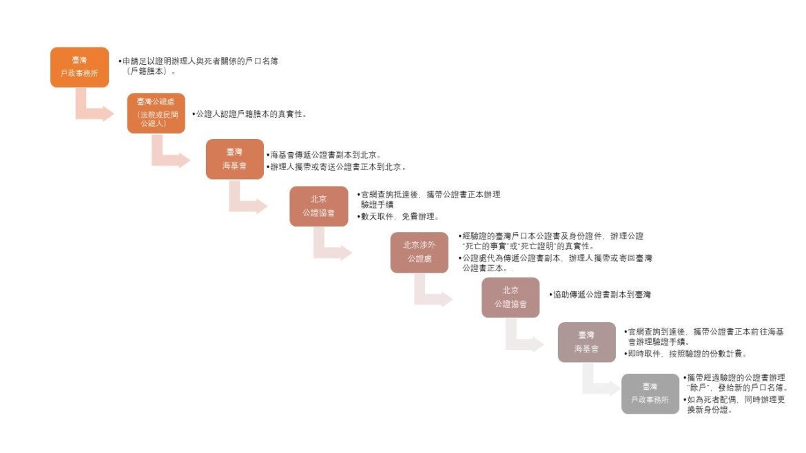 加入收藏 目錄 「雲中逆旅」專欄/臺灣人在大陸身故,繼承人如何辦理臺灣遺產繼承?一切從公證開始 刊登日期 2024-10-21 更新日期 2024-10-21 4 0 「雲中逆旅」專欄/臺灣人在大陸身故,繼承人如何辦理臺灣遺產繼承?一切從公證開始 文:盧律師(認證法律人) 刊登日期 2024-10-21 更新日期 2024-10-21 4 0 臺灣人在大陸亡故,通常由醫院或公安機關開具死亡證明[1],家屬必須仔細核對登載的資訊,並且妥善保管[2]。不過,如果要在臺灣辦理戶政及繼承事務,大陸的死亡證明書是無法直接使用的,必須先經過公證及查驗的手續。根據兩岸在1993年簽署的「兩岸公證書使用查證協議」,臺灣和大陸分別由臺灣的財團法人海峽交流基金會(以下簡稱海基會),和大陸的中國公證員協會或有關省、自治區、直轄市公證員協會,來負責寄送及查證公證書的事宜[3]。 一、兩岸文件要先在出具方辦理公證(認證),再經對方查驗[4],才能使用 在大陸辦理與臺灣相關的公證比較特殊,公證處必須具有辦理「涉台」公證的資質,不是所有的公證處都可以辦理,所以辦理前,必須提前詢問並確認。 一般是死者的配偶或親屬前往辦理死亡公證事務,如果也是臺灣人,除了辦理人與死者的證件(臺胞證)外,還必須提供辦理人與死者親屬關係的證明文件,例如臺灣的戶口名簿(或戶籍謄本)或婚姻關係的證明。同樣的,臺灣的文書在大陸也無法直接使用,必須先在臺灣各地方法院公證處或所屬民間公證人事務所,由臺灣公證人認證[5],並經過大陸公證協會的核驗後,後續才能在大陸的公證處用來申辦死亡公證書[6]。而在大陸製作的死亡公證書,也必須經過海基會驗證後[7],在臺灣的法院或主管機關才能作為認定依據[8]。 透過兩岸文書傳遞和查驗手續後,配偶或繼承人才可以開始辦理臺灣的繼承事務。以北京為例,兩岸公證書(認證書)的寄送及查驗流程,如下圖1: 圖1:兩岸公證書寄送及查驗流程 資料來源:作者自製。 二、寄送進度可上網或電話查詢,文書到達後再去辦理查驗 不論在大陸或臺灣的公證處辦理公證(認證)時,公證人都會將公證書的正本交還給辦理人,副本則要寄送到對岸:在大陸是透過當地的公證協會寄到臺灣海基會,臺灣則是透過海基會寄到辦理人指定使用的省份(或直轄市、自治區)[9]的公證協會[10]。辦理人可以透過官方網站查詢文書寄送的進度,例如北京市公證協會的「涉台公證副本寄送查詢」、臺灣海基會的「民眾查詢文書驗證申辦進度系統-文書驗證查詢」。當文書副本到達當地時,再持身分證件及公證書的正本前往辦理查驗手續[11]。 附帶一提,臺灣海基會辦驗證一般是採取「馬上辦」的原則,通常1小時就會發給證明[12],並按件數收費,原則上1份要新臺幣300元[13];北京市公證協會則是經申請後,按通知的日期前往取件(通常是3個工作日)[14],目前核驗手續不收費[15]。 三、取得驗證過的大陸公證書,在臺灣辦理繼承 當取得經過臺灣海基會驗證後的大陸公證書,配偶或其他繼承人就可以前往戶政事務所辦理「除戶」(死亡登記),同時向臺灣的稅務機構申報,開始辦理臺灣遺產的繼承手續。根據規定,原則上繼承人必須在被繼承人死亡的次日起6個月內申報遺產稅[16]。不過,當被繼承人在大陸地區死亡,經大陸地區有關單位出具死亡證明者,則可以延至「海基會的驗證證明之日」起算[17]。兩岸文書的公證驗證程式繁瑣,寄送傳遞也耗費時日,這也是符合實際情況的彈性調整。