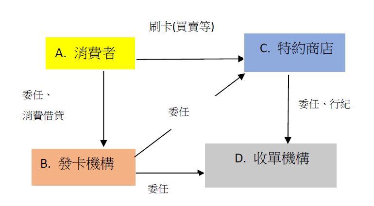 所有文章 / 消費‧借還錢‧契約 / 信用卡消費 信用卡法律關係(一)——信用卡的正式定義與交易流程是什麼? 信用卡 消費借貸 委任 消費者 文:江皇樺(認證法律人) 刊登於 2018-10-24 最後更新於 2022-11-29 信用卡在我國使用由來已久,一般人持信用卡向商店購買物品延後付款,背後牽涉了複雜法律關係。包括以下四方當事人(圖1): A﹒ 消費者、 B﹒ 發卡機構(如銀行)、 C﹒ 特約商店、 D﹒ 收單機構(即財團法人聯合信用卡處理中心)。 圖1 信用卡交易的當事人,以及各當事人之間的契約定性 資料來源:作者自製。 為了更了解信用卡法律問題,本篇先對信用卡下定義並簡述信用卡交易流程。同時為了讓大家更清楚辨認信用卡各當事人間的法律關係,分別於另外兩篇文章[1]繼續說明。 一、信用卡定義 一般大眾都知道信用卡是做為消費時先記錄而未付款,等一定期間到期後,就這一段期間內消費的金額予以付款之工具。信用卡的正式定義可參考信用卡業務機構管理辦法第2條第1款[2]。 二、信用卡交易流程 (一)消費者向發卡機構申請信用卡,發卡機構核發信用卡。經開卡完成後,消費者可拿信用卡到特約商店消費並延後付款。 (二)特約商店依照與收單機構間的約定,有接受信用卡消費之義務,並向收單機構請款。 (三)收單機構匯整款項後,傳送資料給發卡機構,由發卡機構付款給收單機構,再由收單機構付款給特約商店。 (四)發卡機構向消費者請款。 延伸閱讀 《信用卡法律關係(二)——消費者與發卡機構或特約商店間的關係是什麼?》。 《信用卡法律關係(三)——消費者以外組織之間的關係是什麼?》。