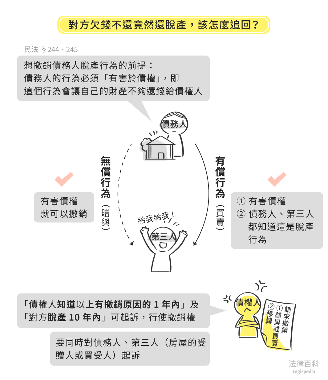 為了保障債權人,民法第244條[1]設有「撤銷權」的規定,讓債權人有機會請求法院撤銷債務人的脫產行為。關於本條規定,至少有以下幾點應該注意:(見圖1)