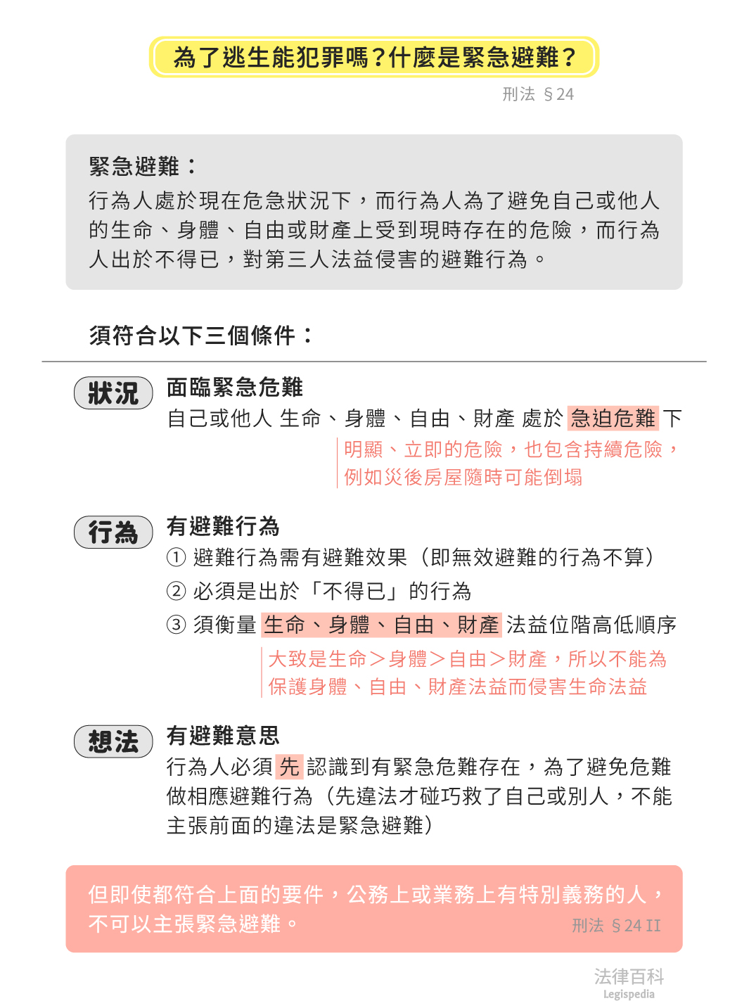 所有文章 / 刑事犯罪 / 刑法原則 為了逃生能犯罪嗎?什麼是刑法上的「緊急避難」? 緊急避難 避難行為 緊急危難 阻卻違法事由 違法性 文:王劭農(認證法律人) 刊登於 2023-11-03 最後更新於 2024-01-12 A至外地出差投宿汽車旅館。在夜深人靜休息時,突聽聞警鈴大作而驚醒,這才發現旅館失火且火勢猛烈,轉眼間門把已相當燙手無法開門逃生,為了保全生命只好打破房間落地窗自二樓逃生,A是否成立刑法毀損罪? A將旅館房間的落地窗打破,可能成立刑法第354條毀損罪[1]。不過此時A處於旅館失火,自己有生命危險的「緊急危難」中,又無法透過一般逃生路線離去,「不得已」之下只好打破落地窗逃生,因此可能依據刑法第24條第1項緊急避難的規定,「因避免自己或他人生命、身體、自由、財產之緊急危難而出於不得已之行為,不罰。[2]」主張不成立毀損罪。以下分別討論刑法第24條緊急避難的要件。(見圖1) 圖1 為了逃生能犯罪嗎?什麼是緊急避難? 資料來源:王劭農 / 繪圖:Yen 一、面臨緊急危難 依照刑法第24條第1項規定,只有在威脅自己或他人「生命、身體、自由、財產」的急迫危難下,才能主張緊急避難: (一)限於避免「生命、身體、自由、財產」受損 緊急避難可能損害其他無辜人的利益,因此只有條文當中明文列出的這4種法益受到侵害時才能適用。火災已造成A失去生命或身體受傷的危險,危害A的生命與身體法益,符合本要件。 (二)危難必須緊急 迫在眉睫、即將發生的「明顯、立即危險」當然算,如本例中的火災。另外,還包含「持續危險」[3],例如火災後該旅館結構受損搖搖欲墜、隨時可能倒塌,旅館主人卻堅持不拆除,周圍建築物屋主僱用工程團隊拆除該旅館也適用此規定。 二、避難行為 (一)需要具有避難效果 必須是能達到避免危險的目的的有效手段[4]。假設A於過程中把房間內電視砸毀,而毀損電視無助於A逃生,因此對於毀損電視的行為無法主張緊急避難。 (二)必須是出於「不得已」的行為 刑法第24條第1項規定「出於不得已之行為」,這裡的「不得已」是指除了所使用手段外,已經別無他法[5]。因為緊急避難行為的侵害對象通常是無辜的人,因此假如當時還有逃跑、報警等不會侵害他人或至少侵害較小的方式,就不符合此要件。 案例中,旅館失火且門把已經高溫、燙手,未必等得到消防人員及時趕到,此時A除了打破二樓落地窗,難以想像還有其他逃生手段,則A打破落地窗的行為應該可以認為是一種符合本要件的不得已手段。 (三)法益衡量 緊急避難之所以允許行為人侵害無辜人權益而不會受到懲罰,是因為避難行為所保護的法益超過所犧牲的法益,對於社會整體來說有益,因此例外不處罰。 衡量的標準可以從法益位階的高低來判斷,判斷標準大致上是:生命[6]>身體>自由>財產,所以不可以為了保護財產、自由或身體法益,損害生命法益[7]。假如兩種利益相等、甚至被侵害的利益較小,由於沒有增進整體社會利益,也就無法透過緊急避難主張不成立犯罪。 案例中A的生命安全的法益位階高於旅館落地窗(財產),所以允許A為了保護自己的生命而犧牲他人的財產,毀損落地窗的行為不會受到刑法處罰。 三、避難意思 行為人必須先認識到有緊急危難存在,為了避免危難做相應避難行為[8]。如果沒有發現有緊急危難,先違法之後才碰巧發現救了自己或其他人,就無法主張先前的違法行為是緊急避難[9]。例如宋代的司馬光發現水缸中有小孩受困,為了救人打破水缸,如果司馬光在現代臺灣,就可以主張緊急避難;但假如司馬光一開始沒發現有小孩受困,因為其他原因故意打破水缸,之後才發現恰巧救了受困的小孩,對打破水缸的行為仍無法主張緊急避難[10],而可能成立刑法毀損罪[11]。 四、公務、業務上限制 即使都符合上面的要件,但刑法第24條第2項規定,公務上或業務上有特別義務的人,不可以主張緊急避難[12]。例如警察本身有維護治安的義務,因此面對持槍械歹徒時,應該照職務上訓練呼叫增援圍捕等,不能為了自己的安危破門闖入一般無辜民眾家中避難。 但為了避免限制過於苛刻,如果所面臨風險與他業務會遇到的通常危險無關,則不受限制,仍可主張緊急避難[13]。例如一般公家機關負責文書、行政的科員碰到持槍械歹徒,由於與歹徒對峙並不是科員的職責,若他的行為符合法定要件,依然成立緊急避難。 延伸閱讀 洪偉修(2022),《為了壓制小偷造成對方受傷,有罪嗎?什麼是正當防衛?》。
