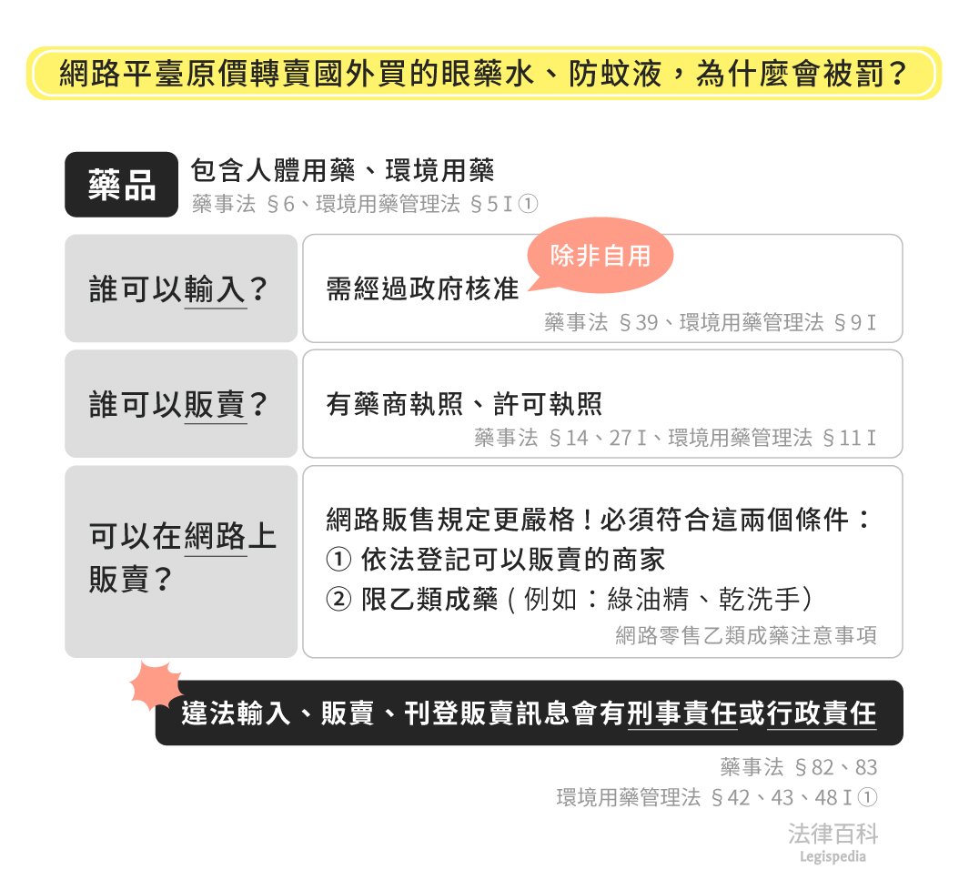 圖1 網路平臺原價轉賣國外買的眼藥水、防蚊液,為什麼會被罰?||資料來源:鍾秀瑋 / 繪圖:Yen