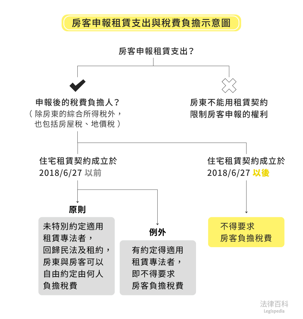 所有文章 / 房子‧土地‧鄰居 / 房屋租賃 租賃契約中約定「房客不可以申報租賃支出」、或「租賃房屋相關稅捐由房客負擔」,這樣是合法的嗎? 租賃契約 租賃支出 稅捐 列舉扣除 所得稅 文:楊舒婷(認證法律人) 刊登於 2021-08-20 最後更新於 2022-11-25 一、依法報稅是義務,房東禁止房客申報租賃支出,已經違法 在每年5月申報綜合所得稅時,租屋房客可以透過「房屋租金支出」的列舉扣除額來節稅,每戶最多有12萬元的扣除額[1]。但房客申報租賃支出的同時,房東相對就會有一筆租金收入,從而導致房東的納稅額變高!因此坊間常會聽到房東要求房客不要申報租賃支出,但這是合法的嗎? 依所得稅法第2條第1項[2]:「凡有中華民國來源所得之個人,應就其中華民國來源之所得,依本法規定,課徵綜合所得稅。」所以房東要求房客不要申報租賃支出、隱藏自己收入的行為,其實是逃稅的違法行為! 此外,內政部頒訂的「住宅租賃定型化契約應記載及不得記載事項」和「住宅租賃契約應約定及不得約定事項」都有明確規定,不得記載、約定承租人「不得」申報租賃費用支出(表1)[3]。因此,租賃契約中若有「房客不可以申報租賃支出」的約定,其實是無效的[4]!房客若真要列舉申報房屋租金支出扣除額,並不需要經過房東同意,如果有房東故意刁難,房客可以檢附資料向國稅局檢舉[5]。 二、2018年6月27日後成立的住宅租賃契約,稅費均由「房東」負擔 因為租賃契約所生的爭執層出不窮,為了將權利義務明確化,保障人民的居住權,立法者便針對「居住用」的房屋租賃關係,制定「租賃住宅市場發展及管理條例」(俗稱「租賃專法」),並自2018年6月27日施行。 其中第40條第3項[6]規定:「本條例施行前已訂定之租賃契約或委託管理租賃住宅契約,其租賃或委託管理期間持續至本條例施行之日以後者,不適用本條例規定。但當事人約定適用本條例規定者,從其約定。」 換句話說,居住用的房屋租賃契約中,該怎麼約定稅費負擔方式?2018年6月27日等於是一個分水嶺。 (一)租賃契約成立於2018年6月27日前,得由當事人自由約定 依照前面提到的租賃專法第40條第3項規定,租賃契約成立於2018年6月27日前的話,原則上不會適用租賃專法(除非雙方有另外約定),而是回歸民法。 回到民法第427條[7]規定,就租賃物應納的一切稅捐,都是由「出租人」即房東負擔,但實務見解[8]認為,這個條文並不是強制約定,依照私法自治、契約自由原則,即便約定由房客負擔也無妨,只要雙方講好即可[9]。 (二)租賃契約成立於2018年6月27日後,不得要求房客負擔稅費 租賃專法中雖然沒有直接規定稅費的負擔方式,但它授權中央主管機關針對「不具消費關係」[10]的租賃契約,制訂應約定及不得約定事項[11],因此內政部便頒訂了「住宅租賃契約應約定及不得約定事項」;也另外依照消費者保護法[12],就「具有消費關係」的住宅租賃契約頒訂了「住宅租賃定型化契約應記載及不得記載事項」。 1. 房屋稅、地價稅 在以上兩個內政部頒訂的規定內,(「應記載/約定事項」中)都有明文規範[13]:「租賃住宅之房屋稅、地價稅由出租人負擔。」(表1)因此,若有租賃契約仍約定房屋稅、地價稅由承租人負擔,這個約定就會依法無效[14]。 2. 綜合所得稅 雖然在以上兩個規定內都沒有很明確的指出「綜合所得稅」應由哪一方負擔,但因為在「不得記載/約定事項」中,都另有「不得記載/約定應由出租人負擔之稅賦,若較出租前增加時,其增加部分由承租人負擔」的規定(表1)[15],所以從結論上而言,房東因為出租房屋而被課徵較多的綜合所得稅時,也不能請求房客負擔[16]。 表1 內政部的申報租賃支出、稅費負擔規範整理表 資料來源:楊舒婷 / 繪圖:Yen 三、結論 總結來說,不論租賃契約內是否有禁止申報租賃支出的約定,房客都可以依法申報(即使有禁止的約定,約定也無效)! 至於申報後的稅費負擔人是誰?則視住宅租約成立時點而定,在租賃專法施行前(也就是2018年6月27日前)所成立的契約,除非有特別約定要適用租賃專法,否則就是回歸民法,可以透過私法自治,讓雙方當事人自由約定要誰負擔;但若是租賃專法施行後才成立的租賃契約,不論是房屋稅、地價稅、綜合所得稅,都不能要求由房客負擔。(見圖1) 圖1 房客申報租賃支出與稅費負擔示意圖 資料來源:楊舒婷 / 繪圖:Yen