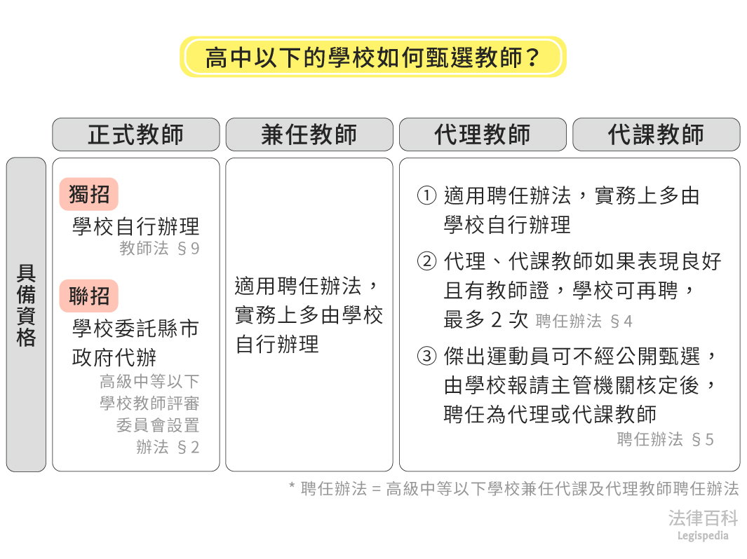 所有文章 / 勞動‧工作 / 教師 正式、兼任、代理和代課教師的資格和聘任規定 正式教師 代理教師 代課教師 教師聘任 兼任教師 文:陳玠宇(認證法律人) 刊登於 2021-11-12 最後更新於 2023-02-21 在高中以下的教育體制中,可以將教師約略分為四種類型:正式、兼任、代理和代課教師,不同類型的教師在資格要求、聘任程序方面有不同規定。之後也會介紹關於工作內容與時間、薪資與獎金的不同。 一、學校教師的類別與資格(見圖1) 圖1 高中以下的教師該具備哪些資格? 資料來源:陳玠宇 / 繪圖:Yen (一)正式教師 具備合格教師證書,教師證書的取得在高級中等以下學校採檢定制,專科學校則採審定制[1]。通過檢定或審定後,才能參加教師甄選,甄選又可分為地區聯招和學校獨招,通過甄選者由考取學校聘任,成為學校編制內的正式教師。除非有教師法所規定的特殊事由,例如犯強制性交被判有罪確定,否則學校不能任意解聘正式教師[2]。 (二)兼任教師 原則上具備合格教師證書,負責編制內教師依規定排課後尚餘的課務,或特殊類科的課務。或者如學校藝術才能班因課程需要,需聘任兼任教師時,校長可以聘任具藝術專長的校外人士,此時例外不需具備合格教師證書[3]。 (三)代理或代課教師 學校編制內的正式教師可能因公差、請假或其他原因而留下課務,這時學校會聘任代理或代課教師來暫代正式教師的課務(代理教師的工作時間為全部時間,代課教師則為部分時間),聘請任期3個月以上的代理或代課教師,學校需要依下列順序公開甄選[4]: 1. 具有合格教師證書的教師; 2. 若前一種無人報名或未通過甄選,可以聘請修畢師資職前教育課程[5]的教師; 3. 若前兩種都無人報名或未通過甄選,可以聘請具有大學學歷的教師。 依上述規定,只有正式教師和兼任教師(藝術才能班有例外)才需要具備合格的教師證書。在代理和代課教師的甄選程序中,學校有機會聘請已通過師資培育但不具教師證的教師,或甚至不具教師證也沒有修習師資培育課程的大學畢業生。 二、學校如何甄選教師(見圖2) 圖2 高中以下的學校如何甄選教師? 資料來源:陳玠宇 / 繪圖:Yen (一)正式教師的聘任 目前學校甄選正式教師主要透過兩種方式:學校自行辦理教師甄選(一般稱獨招),或由學校委託所屬縣市政府代辦(一般稱聯招)。 1. 學校自行辦理教師甄選 依照教師法第9條規定,教師的聘任需經過校內教師評審委員會審查通過後,再由校長聘任[6],故原則上應由學校自行辦理教師甄選。但自行辦理甄選需耗費相當的資源,對學校行政造成沈重的負擔,且甄選不公與內定人選等傳聞,讓大眾對學校獨招的公平性產生質疑,也讓許多學校不再自辦教師甄選,而委由各縣市教育局辦理[7]。 2. 委託地方政府辦理教師甄選 依高級中等以下學校教師評審委員會設置辦法第2條規定[8],學校教師評審委員會可以將教師甄選委託主管機關辦理,這也是地方教育局辦理聯招的法源依據。近年來越來越多地方政府辦理教師聯招,如臺北市於2021年即首次辦理高中教師聯招,期盼能解決過往獨招體制衍生的問題[9]。 (二)兼任、代理或代課教師的聘任 兼任、代理或代課教師的聘任,則適用同一部辦法。其中代理或代課教師多為補足編制內教師請假所遺留的人力空缺,需求和聘期皆不固定,故實務上多由學校自行辦理教師甄選,以下補充兩點較為特殊的規定。 1. 代理或代課教師的再聘 代理或代課教師的聘期並不固定,至多1年,不但造成教學現場師資不穩定,教師端也缺乏保障。因此2012年教育部修正代課及代理教師聘任的規定,學校聘任3個月以上的代課或代理教師,表現優良且具有教師證者,學校可以再聘,再聘最多為2次(最長2年)[10],以解決過去某些班級年年換老師的現象。 2. 傑出運動員的聘任 為了鼓勵傑出運動員,並保障選手生涯結束後的發展,代課及代理教師聘任辦法亦規定,符合條件的傑出運動員,經學校認定學歷、專長足以任教的話,可以不用經過公開甄選,由學校報請主管機關核定後,聘任該運動員為代課或代理教師[11]。