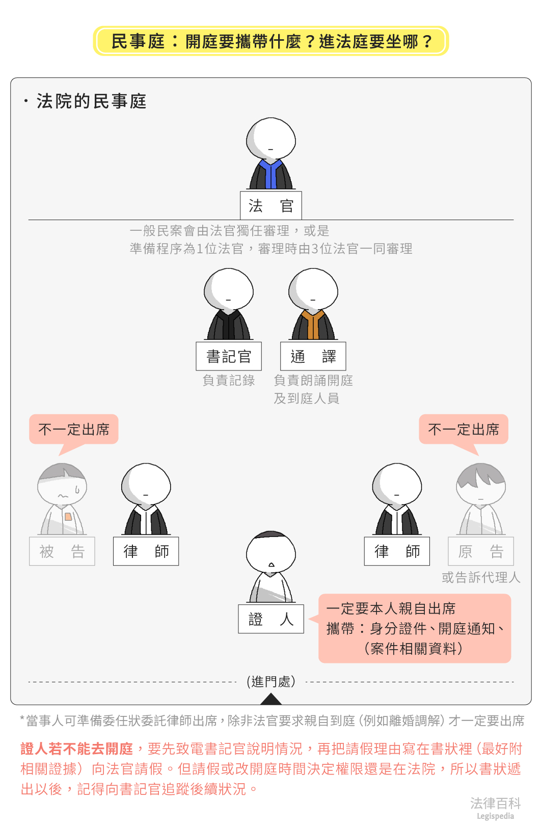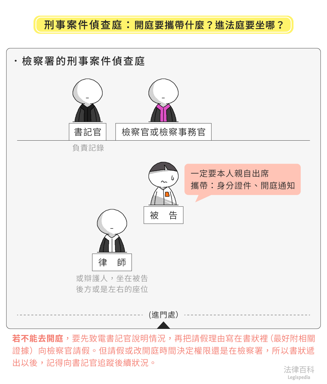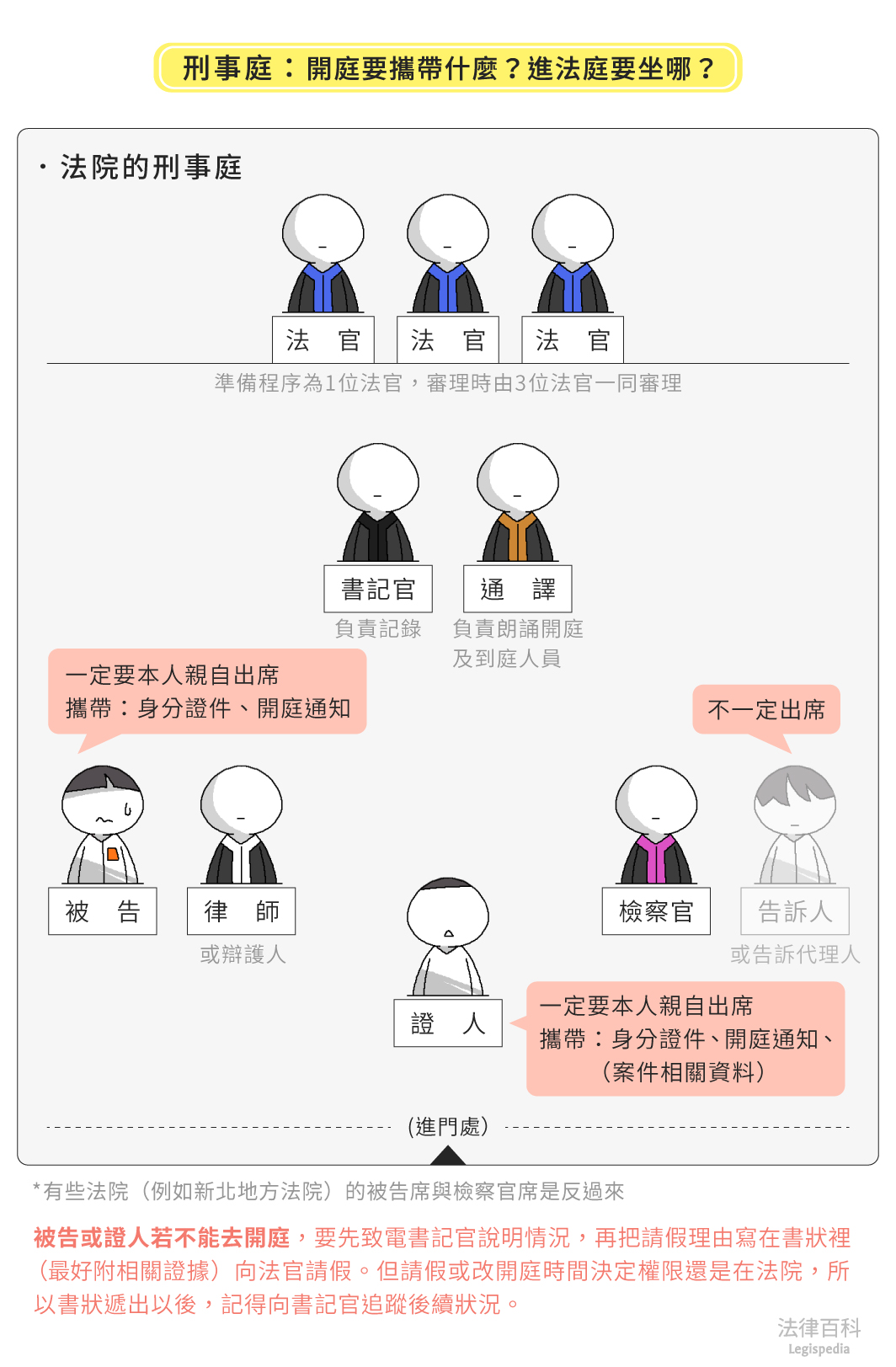 所有文章 / 法律入門 / 法律入門 進法庭要坐哪?不能去開庭要先跟誰說?開庭要記得帶哪些東西? 開庭座位 傳票 開庭通知 法庭配置 請假 文:郭欣妍(認證法律人) 刊登於 2024-08-23 最後更新於 2025-05-29 一、進法庭要坐哪?坐在上面的就是法官嗎? 當我們收到開庭通知書時,可以先觀察是由檢察署或法院核發的通知單。開庭有分成兩種,檢察署以及法院。以下以筆者熟悉的臺中地方檢察署、臺中地方法院及高等法院臺中分院的配置,說明法庭內的座位: (一)檢察署的刑事案件偵查程序[1](見圖1) 圖1 刑事案件偵查庭:開庭要攜帶什麼?進法庭要坐哪? 資料來源:郭欣妍 / 繪圖:Yen 由檢察署檢察官或檢察事務官主持開庭,因此坐在上面的是檢察官或是檢察事務官,不是法官,旁邊則會由書記官負責記錄。 被告會單獨坐在下方正中間的應訊位置,前方會有配置電腦螢幕可以看到檢察官或檢察事務官問的問題,律師(辯護人)則會另外坐在被告後方或是左右的座位,不會和被告坐在一起。 (二)法院開庭的刑事案件或民事事件 1. 刑事案件[2](見圖2) 圖2 刑事庭:開庭要攜帶什麼?進法庭要坐哪? 資料來源:郭欣妍 / 繪圖:Yen 一般刑案會由1位法官進行準備程序[3],審理時由3位法官(受命法官、陪席法官、審判長)一同審理,此時,確實就是身穿代表公平、正義鑲藍邊黑色法袍[4]的法官坐在上方位置,書記官及通譯則坐於法官席下方位置,負責記錄的是身穿黑邊黑袍的書記官,負責朗誦開庭及到庭人員的則是身穿金邊黑袍的通譯。 檢察官席則由蒞庭檢察官出席代表告訴方,身穿代表懺悔意義鑲紫邊黑色法袍坐在面對法官席右手邊位置(走進法庭右手邊位置),如果告訴人或告訴代理人有出庭,是坐在檢察官席旁邊告訴人的位置。被告席則由被告及身穿代表忠誠潔白鑲白邊黑色法袍律師一起坐在面對法官席左手邊位置(走進法庭左手邊位置)。但也有法院(例如新北地方法院)是反過來,檢察官坐在面對法官席左手邊位置、被告及律師坐在面對法官席右手邊。 2. 民事案件[5](見圖3) 圖3 民事庭:開庭要攜帶什麼?進法庭要坐哪? 資料來源:郭欣妍 / 繪圖:Yen 一般民案會由法官獨任審理,或是由1位法官行準備程序[6]、3位法官(受命法官、陪席法官、審判長)一同審理。跟刑案一樣,法官身穿藍邊黑色法袍坐在上方法官席位置。原告及原告律師,坐在面對法官席的右手邊位置;被告及被告律師,則坐在面對法官席的左手邊位置。無論是原告或是被告的律師,都是穿鑲白邊的黑色法袍。 在上訴程序中,上訴人(可能是原告也可能是被告)及上訴人律師,坐在面對法官席的右手邊位置;被上訴人及被上訴人律師,則坐在面對法官席的左手邊位置。 (三)依照自己是告人還是被告找位子 由上面的位置分布,可以簡單歸納出一個邏輯,在法院開庭,告訴方、原告方、上訴方,都是坐在面對法官席右手邊位置,也就是一走進法庭的右手邊;相反的,被告方、被上訴方,則是坐在面對法官席左手邊位置,也就是一走進法庭的左手邊。 (四)律師的小建議 如果獨自前往開庭,不曉得自己應該坐在哪個位置,除了可以查看座位前面標示的名牌外,也可以找身著藍色制服的法警,詢問自己應該要坐在那裡。 二、不能去開庭記得先跟書記官說明 開庭前收到的開庭通知單上,會有承辦書記官的「股別」及「電話分機」,如果檢察署或法院安排的開庭時間,有重要的事情無法前往,則可以先致電跟書記官說明情況,請檢察署或法院更改時間;後續通常還要再把同一請假理由寫在書狀裡(最好附上相關證據證明),向檢察官或法官請假[7],不過請假或改開庭時間決定權限還是在檢察署或法院,所以請假或改期書狀遞出去之後,別忘記向書記官追蹤後續狀況;如果是經地檢署起訴到法院,收到法院開庭通知的告訴人,上面會記載告訴人可以用書面陳述意見,自行決定是否到庭。 附帶一提,如果要委任律師陪同或代理出席,也要讓律師知道已經收到開庭通知單,讓律師知悉、安排幾月幾日要前往開庭。 三、本人一定要親自到嗎?開庭要帶哪些東西? (一)刑事案件 刑事偵查案件的被告一定要本人親自出席,並且攜帶身分證件、開庭通知。檢察署開庭前,要先報到將身分證件交給法警,等法警叫到姓名時,再依指示將手機關機[8]、進入法庭開庭。 若在法院開庭,刑事案件被告一樣要親自出席,攜帶身分證件、開庭通知,開庭前向法警報到繳交身分證件後,在法庭外等待開庭。 (二)民事事件 民事事件的當事人可以親自出席,或委託律師與律師一起出席,或只由律師單獨出席,也就是民事事件的原告或被告並不一定要親自出席,除非法官要求要親自到庭(例如離婚調解,因為涉及身分關係改變,法院通常會建議當事人親自出席)。如果要委託律師或是他人代理出席[9],則需準備委任狀給法院[10]。 四、如果是證人收到開庭通知該怎麼辦? 如果收到證人開庭的通知,時間上無法配合的話,一樣要先依照通知書上的「承辦股別」及「電話分機」跟書記官說明自己無法到庭的正當理由,並提出請假的書狀,請檢察署或是法院改期。若沒有正當的理由不到庭,可能會遭裁罰新臺幣3萬元以下罰鍰,嚴重還可能會被拘提[11]。 開庭當日要攜帶身分證件,以及可能與案件相關的資料,前往開庭。開庭時則會坐在法庭正中間證人席位置,會有螢幕可以看法官、檢察官或律師詢問的問題和自己的證詞。 延伸閱讀 