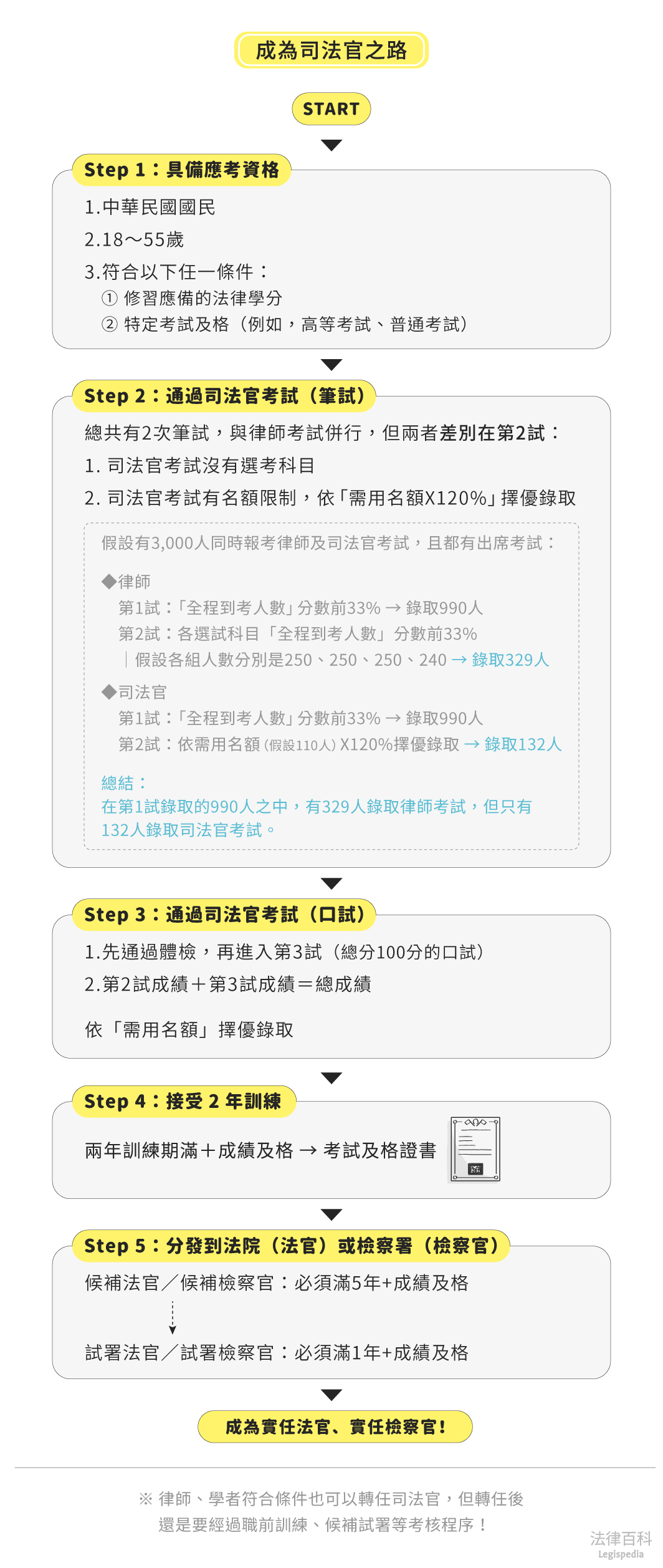 所有文章 / 法律入門 / 法律專業職位介紹 如何成為司法官?司法官的工作內容是什麼?(上)──成為司法官的方式 司法官 法官 檢察官 司法官考試 轉任法官 文:楊舒婷(認證法律人) 刊登於 2024-11-29 最後更新於 2025-01-06 一般所稱的「司法官」,並不是單指負責審判的「法官」[1],其實也包括負責偵查、起訴的「檢察官」,所以不論是要成為法官或檢察官,過程都是一樣的,都需要通過「公務人員特種考試司法官考試[2]」(簡稱「司法官考試」),或是透過律師、學者轉任的方式達成。 本篇會先說明成為司法官的方式(包括考試及受訓),至於法官和檢察官的任務,則會分別於《中篇》及《下篇》文章來介紹。 想要成為司法官有兩種方式,一種是通過考試,一種是轉任,以下分別說明。(見圖1) 圖1 成為司法官之路 資料來源:楊舒婷 / 繪圖:Yen 一、通過司法官國家考試 (一)具備司法官考試的應考資格[3] 1. 必要條件 (1)中華民國國民。 (2)年齡在18歲以上,55歲以下。 2. 擇一條件 (1)相關科系畢業,或曾修習應備的法律相關學分。 (2)經高等考試或與之相當的特種考試司法行政考試及格。 (3)經普通考試或與之相當的特種考試司法行政考試及格「滿3年」。 (4)經高等檢定考試司法官或法務類考試及格。 (二)通過司法官考試,取得受訓資格 相較於律師考試只有二個階段[4],司法官考試則有三個階段[5]。 第一、二試一樣也是筆試,與律師考試併行(科目相同者就採用同一試題)[6],但在第二試有二個主要差別: 律師考試在第二試有選考科目(智慧財產法、勞動社會法、財稅法或海商法與海洋法),這部分佔了100分,所以第二試總分為1000分;但司法官的第二試沒有選考[7],所以第二試總分只有900分。 律師考試的第二試,是以「到考人數前33%為及格」;但司法官考試因為有名額限制,所以通過第二試的標準是以「依需用名額加20%擇優錄取」[8]。 通過司法官考試第二試的人,必須先經過體檢[9],確認身體狀況沒有問題才可以進入第三試,也就是總分100分的口試[10]。不過最終錄取分數,並不只有單看第三試口試分數而已,而是以「第二試筆試成績與第三試口試成績」合併計算[11],所以筆試分數還是要盡量爭取高分! (三)受訓及格,進行分發 通過三階段考試後還必須接受為期2年的訓練,除了基礎講習課程外,也必須到法院、檢察署以及其他行政機關和相關機構,學習實務操作和行政業務等,同時也有許多的考試和報告等著受訓的學員[12];等訓練期滿成績及格,考試院才會發「考試及格證書」,到這裡,才算是完成整個考試程序!接著,合格的司法官們就會被分發到法院(當法官)或檢察署(當檢察官),開始為我國司法付出一己之力[13]。 (四)從候補、試署到實任法官、檢察官 即便經過分發進入法院、檢察署,也不代表可以直接單槍匹馬的上法庭進行實質審判,或立刻辦理偵查、公訴等檢察官事務!司法官必須經過候補5年、試署1年的考核程序[14],成績審查及格後,才能被派任為「實任法官」或「實任檢察官」,不及格的則會被解職淘汰[15]。 二、律師、學者轉任司法官 除了透過考試擔任司法官外,為避免錄取人員過於年輕、缺乏社會歷練或欠缺同理心[16],司法院於近年來開放了「轉任」司法官的方式。 如果曾執行律師業務3年以上者,可以透過司法院的公開甄試,於通過筆試和口試後轉任法官[17];至於律師執業6年以上[18],或曾任教育部審定合格大學或獨立學院專任教授、副教授或助理教授合計6年以上的法學者[19],也可以申請轉任司法官[20]。