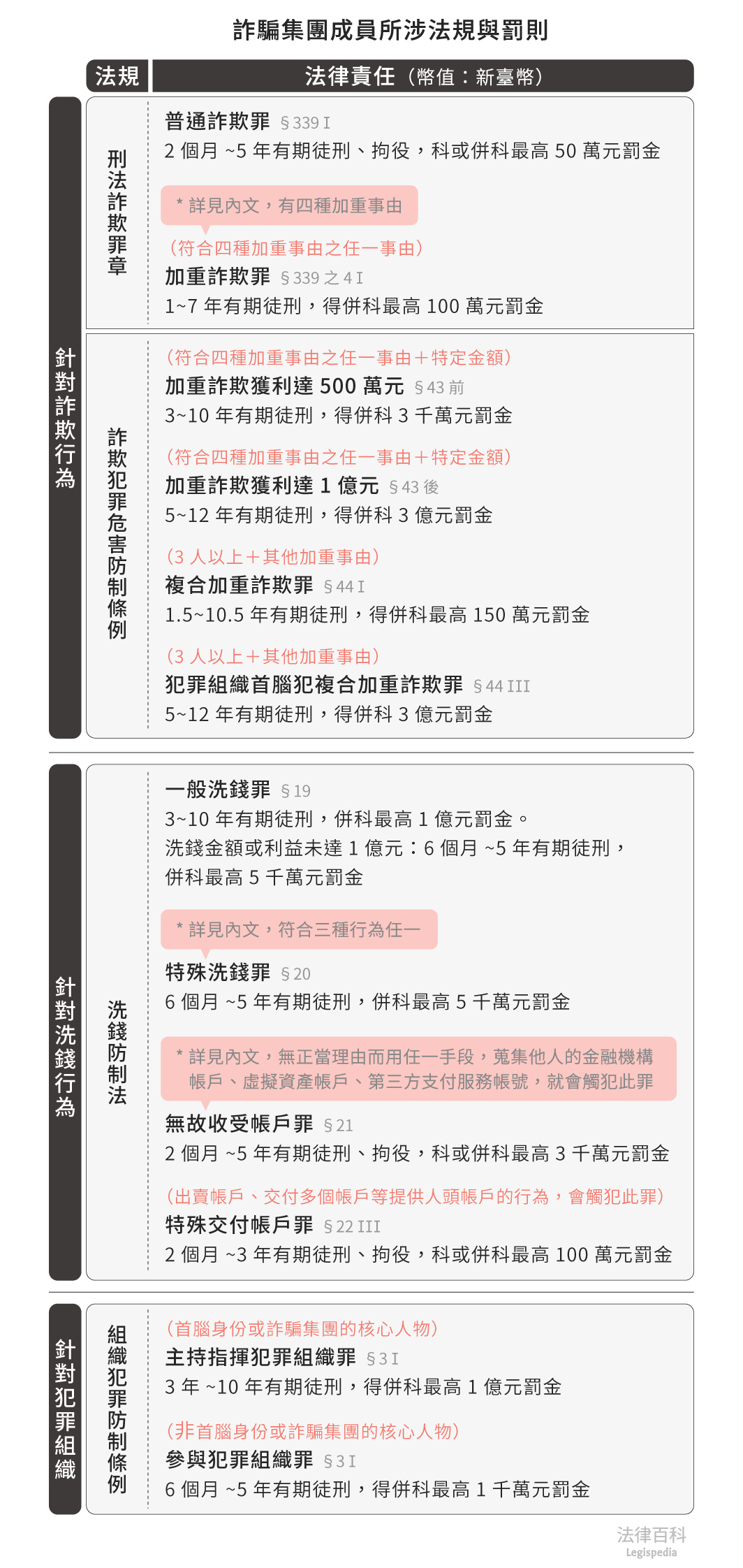 加入收藏 目錄 【詐欺專題】告別「詐騙之島」,我們還需要什麼?專欄/《刑事規範篇》:刑罰的極限?──盤點詐欺犯罪的刑事處罰 刊登日期 2024-11-12 更新日期 2024-11-20 7 0 【詐欺專題】告別「詐騙之島」,我們還需要什麼?專欄/《刑事規範篇》:刑罰的極限?──盤點詐欺犯罪的刑事處罰 文:王琮儀(認證法律人) 刊登日期 2024-11-12 更新日期 2024-11-20 7 0 為了抗制日益猖獗的詐騙集團,刑事法規作為保護法益的規範,能否發揮功能,是相當重要的一環。面對與日俱增的詐欺案件與受害者,近年刑事處罰規範的修正如火如荼,尤其明顯朝向重刑化的趨勢,與人民法感情若合符節。 然而這樣的方向是否真能發揮功能?本篇文章將簡介詐欺犯罪行為人的相關法律責任,包含刑法詐欺罪章、洗錢防制法、組織犯罪防制條例,以及甫於2024年正式上路的詐欺犯罪危害防制條例等規範(如附表1),並邀讀者一同思考,刑罰的輕重之間如何取捨。 表1 詐騙集團成員所涉法規與罰則 資料來源:作者彙整 / 繪圖:Yen ◎真假詐欺?談詐欺罪的基本概念與「假性財產犯罪」 一般常聽到的「詐騙」,在法律上到底是怎麼回事?我們先從理解「詐欺罪」開始,才能逐步建立關於詐欺犯罪的完整面貌。 一、法律上的「詐欺罪」其實是這樣 刑法上的詐欺罪[1],是一種財產犯罪,也就是透過處罰詐欺行為來確保人們的整體財產。而它的基本要件,白話來說是犯罪行為人針對可以確認真偽的事實,傳遞錯誤訊息的行為,也就是①施用詐術[2]。再來則是讓被害人誤判事實,而②陷於錯誤。被害人若因為錯誤訊息而③交付財產或利益給犯罪行為人,被害人進而發生了④財產損害,這整個過程具備⑤貫穿的因果關係,就符合詐欺罪的客觀要件。接著,如果犯罪行為人是出於「一開始就要以前述歷程詐取財物」的主觀想法,法律上就會將犯罪行為人的行為評價為詐欺罪。 隨著犯罪手法推陳出新,刑法針對詐欺罪規定了4種加重的事由[3],包含:①冒用政府機關或公務員名義;②3人以上共同犯罪;③透過廣播電視、電子通訊、網際網路或其他媒體等傳播工具,對公眾散布;④以電腦合成或其他科技方法製作關於他人不實影像、聲音[4](即如Deepfake技術)或電磁紀錄的方法犯罪。透過以上的方法犯加重詐欺罪,法定刑從普通詐欺罪的2個月至5年有期徒刑、拘役,科或併科最高50萬元罰金,提高為1至7年有期徒刑,得併科最高100萬元罰金。 二、詐欺也有假的?談「假性財產犯罪」的難題 (一)什麼是假性財產犯罪? 在理解詐欺罪的成立要件之後,我們就可以知道,有些情況其實並不會構成法律上的詐欺罪,而是需要訴諸其他法律方式來處理,最典型的例子就是「假性財產犯罪[5]」,意指乍看之下會被誤認為財產犯罪,但實際上只是如欠錢不還、拖欠租金等民事債權債務糾紛,而民眾會以提出刑事告訴的方式以刑逼民。 以一般人常見的法律問題來說,大致會涉及民事與刑事法規,而民事法規要處理的是私人之間的權利義務。以財產糾紛而言,例如借款、買賣等債權債務關係,可能會涉及到「債務不履行」的概念,或是需要回歸民法各類契約的規定處理。 (二)假性財產犯罪與詐欺罪的差異 民事上的債權債務糾紛與刑法上的詐欺罪相比,最大的差異就在於當事人的「主觀意圖」,除非有辦法透過客觀證據,證明欠錢或違約者是一開始就抱著詐欺犯罪的主觀意圖,並行使詐術[6],否則在罪刑法定原則之下,雙方的財務糾紛不符合刑法詐欺罪的要件,就無法透過刑事程序加以追訴、處罰,需要回歸民事法律關係來處理紛爭。例如遭欠錢不還,應透過調解或民事起訴,要求債務人返還借款,而非提出刑事告訴來以刑逼民。 (三)假性財產犯罪的難題 假性財產犯罪造成檢察機關負擔的情況,對於有限的司法資源更是雪上加霜,各類財產犯罪案件進入地檢署後,有將近一半的比例不起訴,而其中多為犯罪嫌疑不足,顯示可能有相當數量的民事糾紛進入地檢署,即使最後做出不起訴處分,對於偵查能量的耗費也相當可觀[7]。 不過,對民眾而言,要如何辨認一件紛爭涉及民事或刑事法律,或許並非易事,有認為更深層的牽涉到臺灣社會的法律文化衝突[8],除了持續宣導、由檢察機關以專股或專組形式處理外[9],是否能透過教育來消除法律文化的衝突,降低民眾使用以刑逼民的策略,是仍待嘗試的方向[10]。 ◎詐欺行為伴隨的其他刑事責任 在了解詐欺罪的基本定義,以及隨之而來的各類手法後[11],可以發現以詐欺罪為中心,可以開展出相當複雜的犯罪產業鏈,而其中某些參與者的行為未必直接違犯詐欺罪,要如何適當評價他們的行為是否違法,就必須綜合觀察其他特別刑法,包含洗錢防制法、組織犯罪防制條例、詐欺危害防制條例等規定,才能建立防制詐欺刑事規定的面貌[12]。 從直覺的法感情來說,或許會認為加重刑責與擴大處罰範圍能有效遏止犯罪。但究竟應擴大刑事法規的適用,或者應將重心放在行政監管來降低刑事法規的適用,才能更有效地打擊詐騙集團,是需要嘗試與衡量的議題[13]。 一、錢往何處去?談洗錢防制法 洗錢(Money Laundering)是指把犯罪所得到的收益隱藏起來,讓犯罪偵查機關無法或難以得知收益在哪裡,進而無從發現或檢舉[14]。而我國的洗錢防制法即是針對洗錢問題的主要法規[15],針對特定犯罪[16]的洗錢行為加以處罰。 (一)洗錢罪的處罰規定 1.一般洗錢罪 從事
