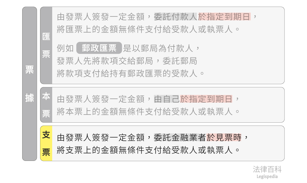 第1項:「稱支票者,謂發票人簽發一定之金額,委託金融業者於見票時,無條件支付與受款人或執票人之票據。」