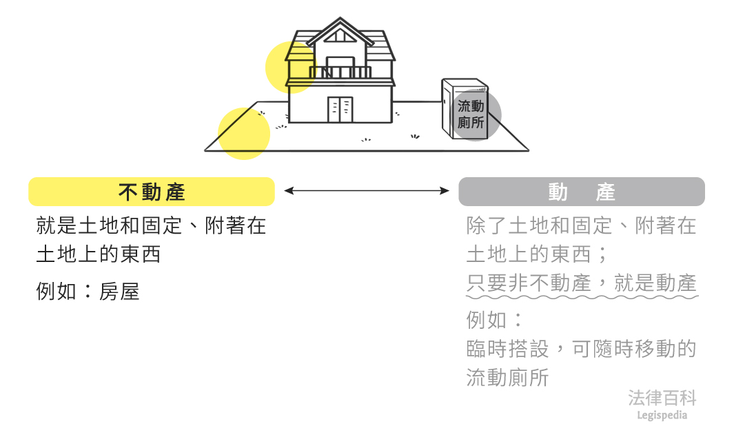 。簡單來說,就是土地和固定、附著在土地上的東西。例如:房屋。