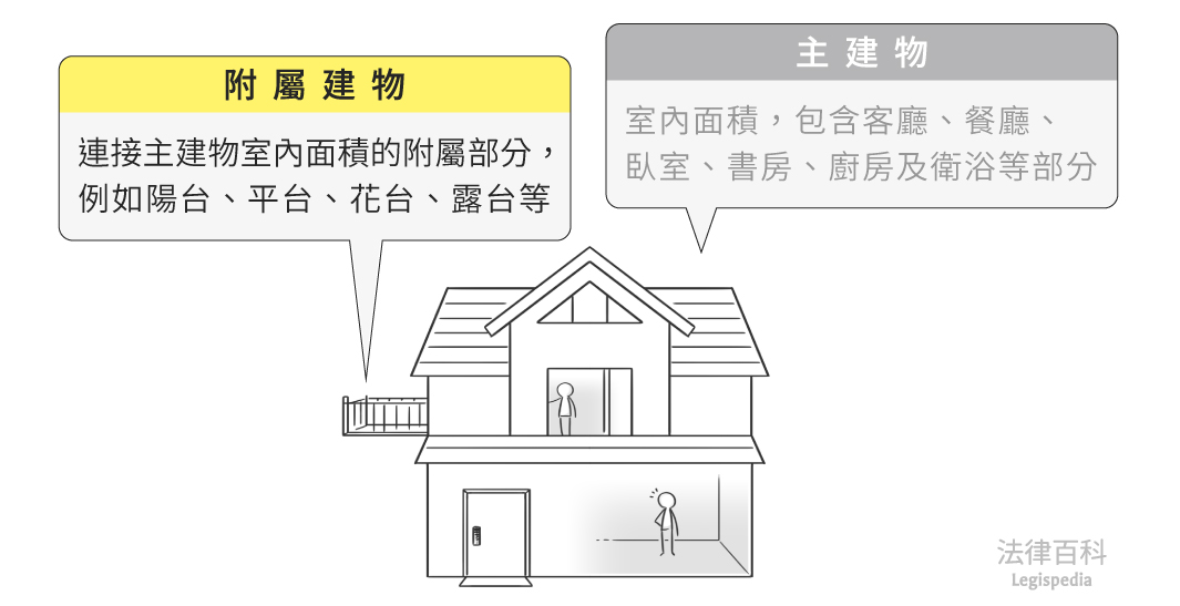 室內面積的附屬部分,例如陽台、平台、花台、露台等。