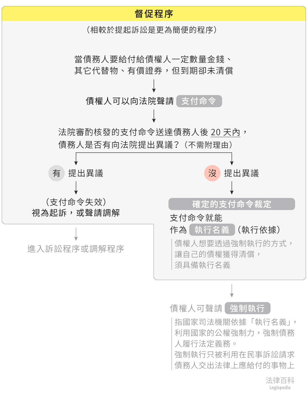 相較於一般提起訴訟更為簡便的程序,民事訴訟法第508條[1]第1項規定:「債權人之請求,以給付金錢或其他代替物或有價證券之一定數量為標的者,得聲請法院依督促程序發支付命令。」亦即,如果債權人是要求債務人給付金錢或其他替代物或有價證券,可以先不用對債務人提出訴訟,而可以先透過這個程序,向法院聲請對債務人發支付命令。
