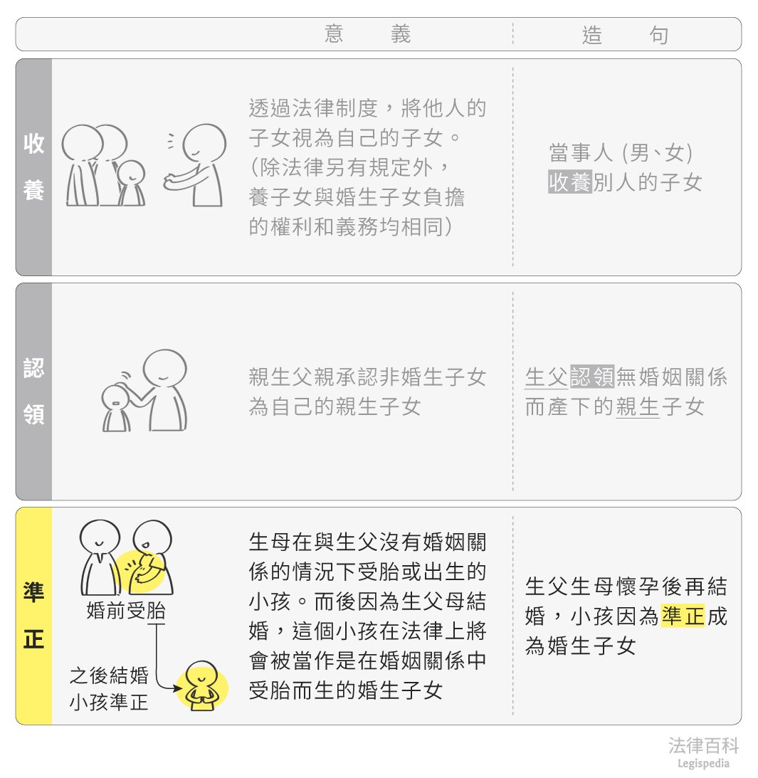 規範在民法第1064條[1],指生母在與生父沒有婚姻關係的情況下受胎[2]或出生的小孩(非婚生子女),而後因為生父母雙方結婚,這個小孩在法律上將會被當作是在婚姻關係存續中受胎而生的婚生子女。也就是民間一般所說「先上車後補票」的情形。