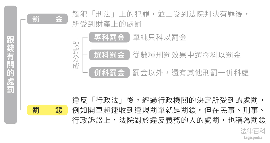 罰鍰(即一般所謂的「罰單」)一般是用在行政法領域,例如:開車超速收到違規罰單就是罰鍰。但在民事、刑事、行政訴訟程序上,法院對於違反義務的人(例如證人受合法通知,沒有正當理由不到庭[1])所科制裁,也稱之為罰鍰。