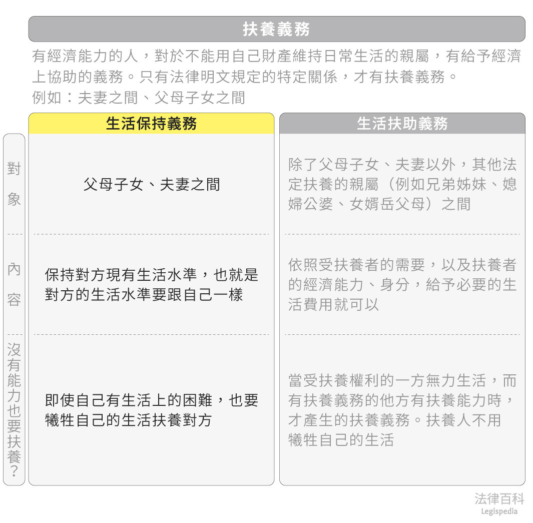 扶養義務分為「生活保持義務」和「生活扶助義務」。