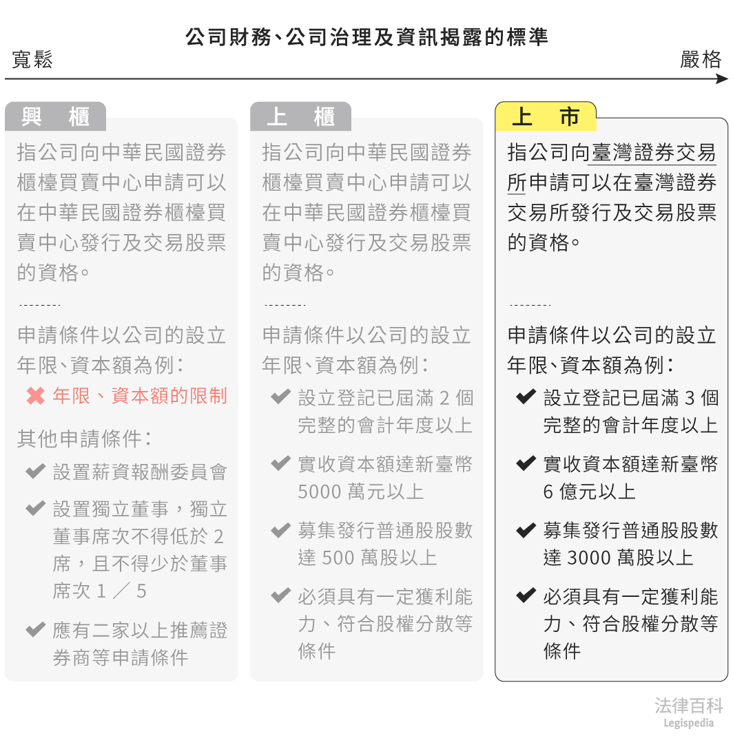 公司向臺灣證券交易所申請可以在臺灣證券交易所發行及交易股票的資格。公司申請上市必須符合嚴格的財務、公司治理及資訊揭露標準,申請時必須已依公司法設立登記屆滿3年以上,並且實收資本額達新臺幣6億元以上,募集發行普通股股數達3000萬股以上,以及具有一定獲利能力、符合股權分散等條件[1]