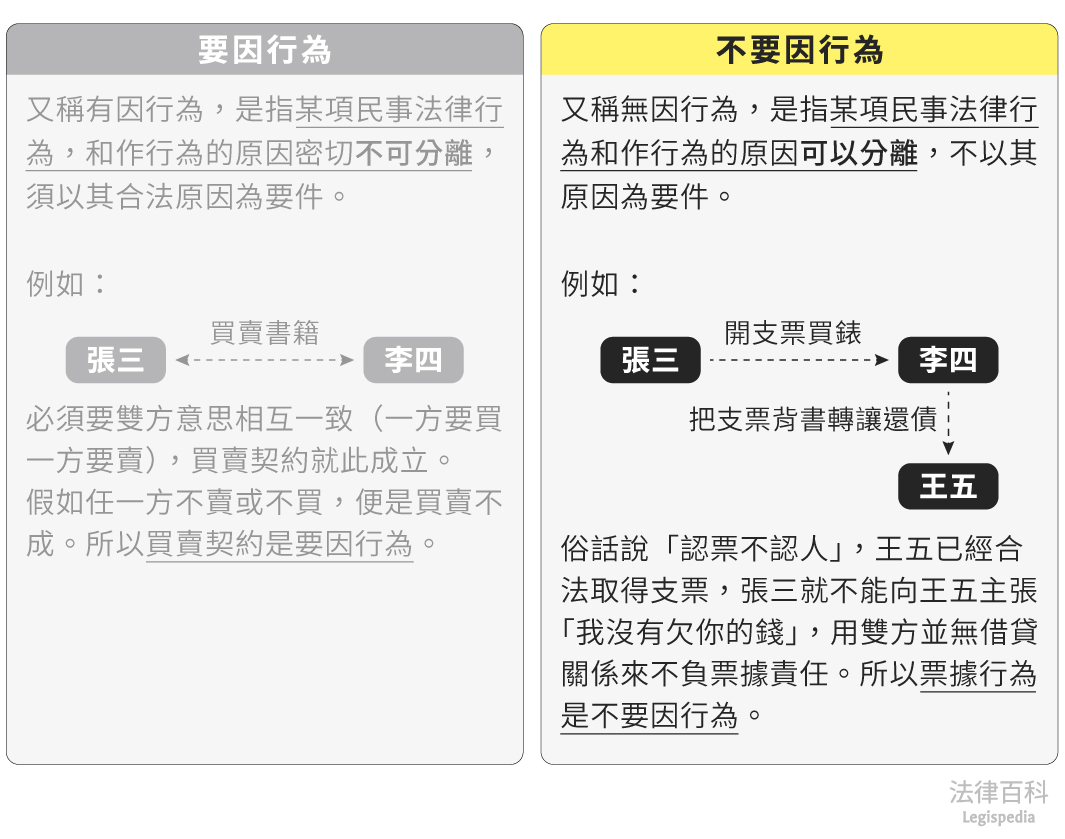 不要因行為(又稱無因行為),是指某項民事法律行為和作行為的原因可以分離,不以其原因為要件者而言。譬如張三簽發一張面額新台幣三萬元的支票給李四,向李四購買一只名牌手錶;李四把支票背書轉讓給王五還債。俗話說「認票不認人」,王五既然已經合法取得支票,張三就不能向王五主張「我沒有欠你的錢」,用雙方並無借貸關係的原因,而不負票據責任。所以票據行為是不要因行為;票據是無因證劵。