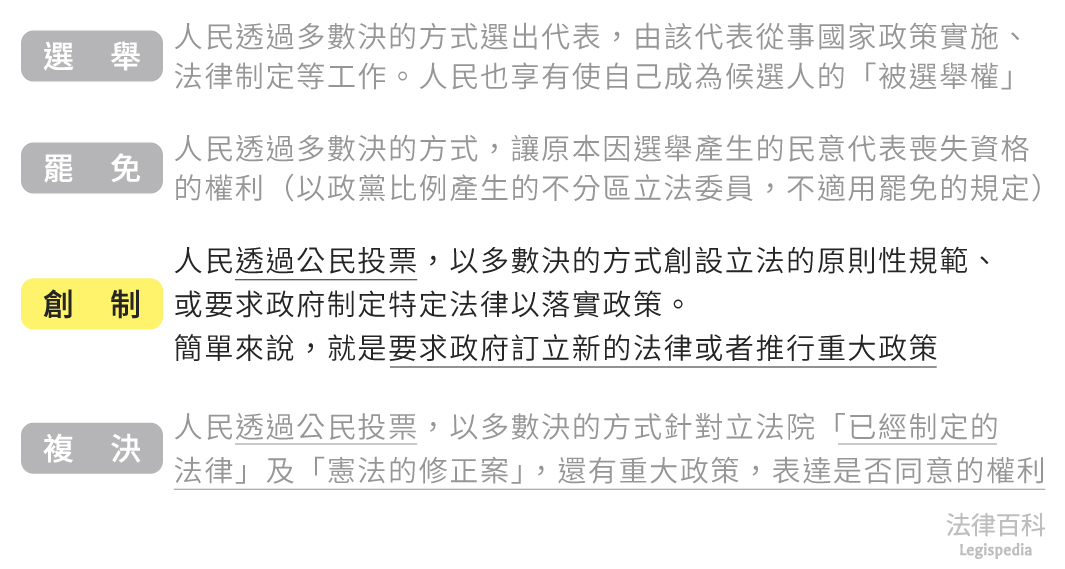 指人民透過公民投票的方式,以多數決的方式創設立法的原則性規範、或要求政府制定特定法律以落實政策[1]。簡單來說,就是要求政府訂立新的法律或者推行重大政策。 而於2018年11月24日舉行的全國性公投中,第12案:「你是否同意以民法婚姻規定以外之其他形式來保障同性別二人經營永久共同生活的權益?」;及第14案:「你是否同意,以民法婚姻章保障同性別二人建立婚姻關係?」便是創制權的展現。
