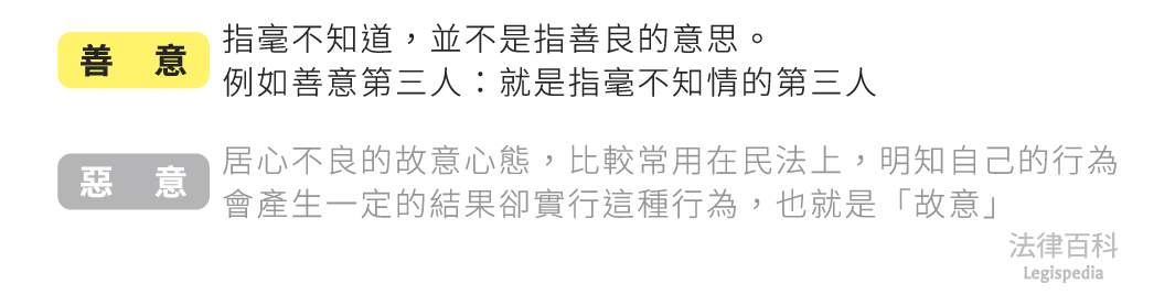 善意是指毫不知道,並不是指善良的意思;與善意相反的用詞是「惡意」,是指「知悉、瞭解」的意思。