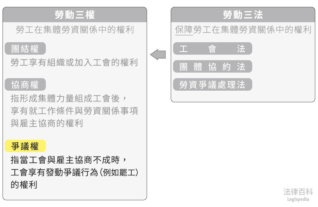 即便有團結權與協商權,勞工可以組工會、跟雇主展開團體協商,但最後是不是能達成雙方有共識的勞動條件,仍在未定之天。如果協商破局或是協商無法展開,這時候工會就只能發動爭議行為(罷工) 來施加壓力,進一步達成協商的可能。 換句話說,「爭議權」是指工會與雇主協商破裂時,有採取爭議行為的權利,目前爭議行為也受到「勞資爭議處理法」[1]的保障,行使的程序都有一定的依據。