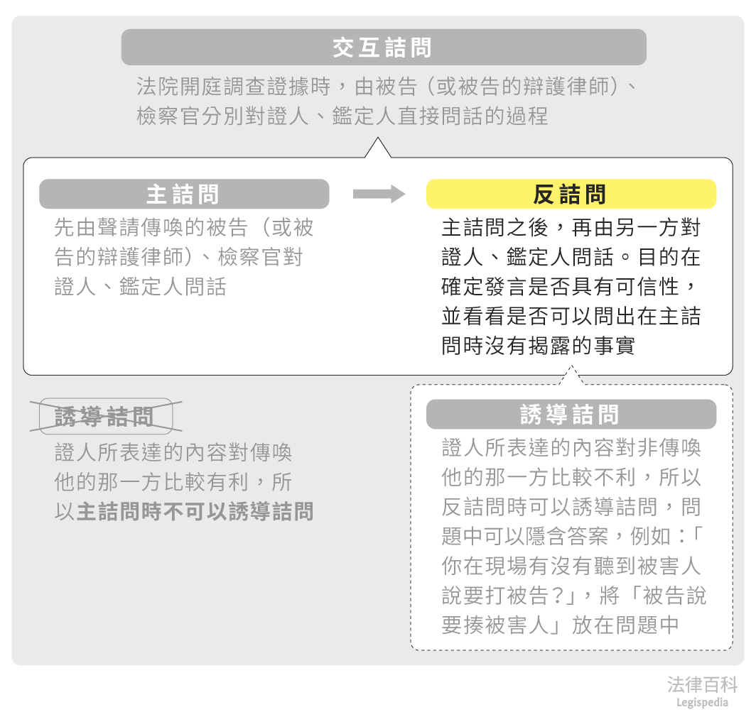 反詰問是指,進行交互詰問時,經過主詰問後,再由對方對證人、鑑定人問話[1]。 反詰問的目的是要確定證人、鑑定人發言是否具有可信性,並看看是否可以問出在主詰問時沒有揭露的事實。 一般來說,證人、鑑定人所表達的內容對反詰問者(非傳喚他的那一方)比較不利,所以反詰問的時候,可以誘導詰問[2],也就是說,可以提出問題中有包含答案的誘導問題,利用這種方式推敲證人或鑑定人的發言內容是真是假。 例如:「你有親眼目睹,還是透過監視器,看到被告在案發當天晚上7點到被害人住的社區?」、「你在現場有沒有聽到被害人說要打被告?」