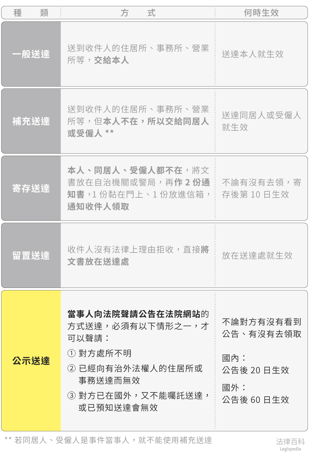 第1項:「對於當事人之送達,有下列各款情形之一者,受訴法院得依聲請,准為公示送達:
