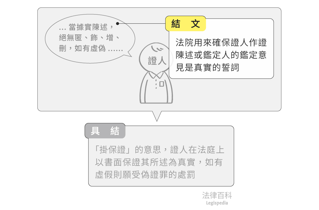 證人的結文通常會記載「今為○○○年度○字第○○號○○案件作證,當據實陳述,絕無匿、飾、增、刪,如有虛偽陳述,願受偽證之處罰,謹此具結[1]。」