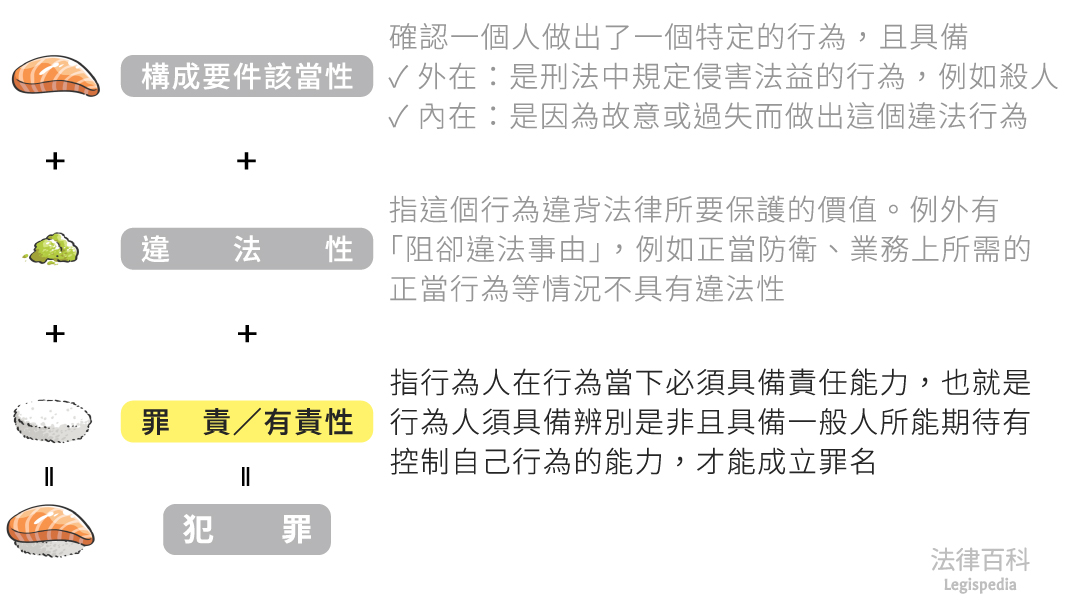 行為人通過刑法犯罪審查的構成要件該當性與違法性階層後,還需通過有責性之檢驗,是指行為人在行為當下必須具備責任能力,也就是行為人須具備辨別是非且具備一般人所能期待有控制自己行為的能力,才能成立罪名。所以說,有罪責始有刑罰,無罪責即無刑罰,而罪責與刑罰必須相當。