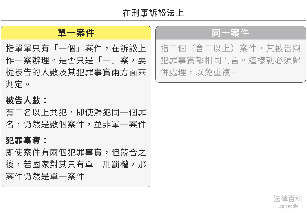 凡是以單一刑罰權為其內容的刑事訴訟案件,稱作單一案件。用淺顯易懂的話來說,是指單單只有「一個」案件,在訴訟上作一案辦理而言。是否只是「一」案,要從被告的人數及其犯罪事實兩方面來判定。舉例來說,張三毆傷李四一人,被告只有一人,他的犯罪事實只有一樁,這是典型的單一案件。假如張三用土製炸彈炸傷了李四和王五,有兩名被害人,雖然是兩個犯罪事實,由於構成刑法第55條想像競合犯,在刑法上只作一罪看待,國家對其只有一個刑罰權,因此全案仍然只是單一案件。至於被告有二人以上共犯的情形,即使觸犯同一個罪名,仍然是數個案件,並非「一」案。