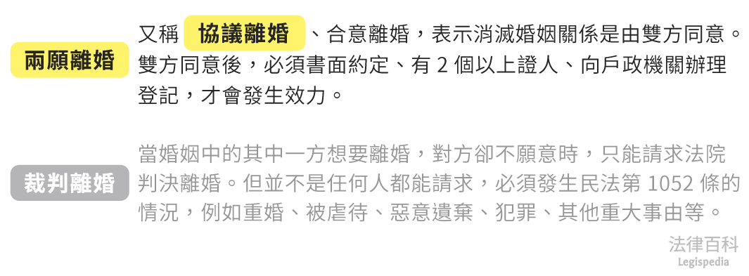 民法上的正式用法是「兩願離婚」,通常也稱為協議離婚、合意離婚,表示消滅婚姻關係是由雙方同意,而不是經過法院審理、做出判決的方式。