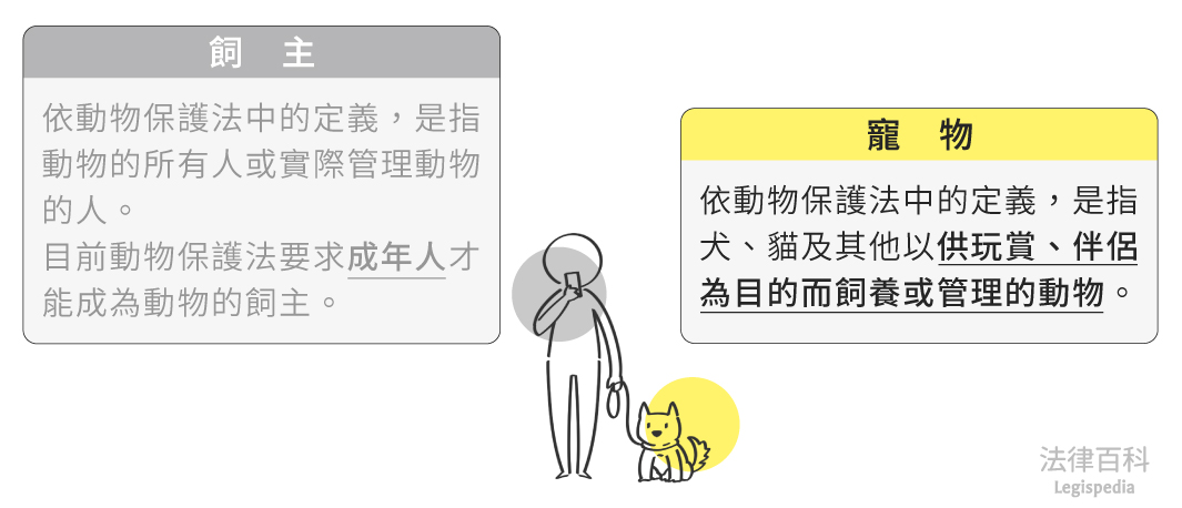 1.   動物保護法第3條第5款:「本法用詞,定義如下:……五、寵物:指犬、貓及其他供玩賞、伴侶之目的而飼養或管領之動物。」