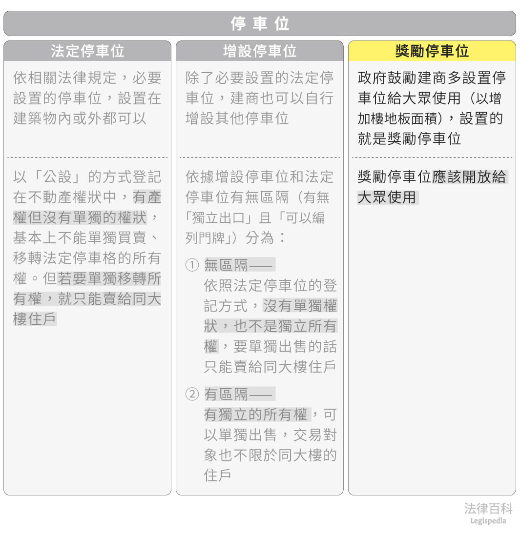 除了獎勵停車位以外,其他停車位還有分法定停車位、增設停車位。