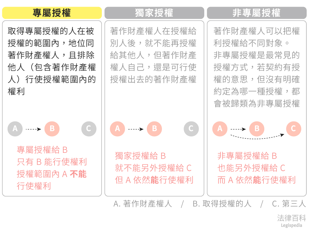 IV 專屬授權之被授權人在被授權範圍內,得以著作財產權人之地位行使權利,並得以自己名義為訴訟上之行為。著作財產權人在專屬授權範圍內,不得行使權利。