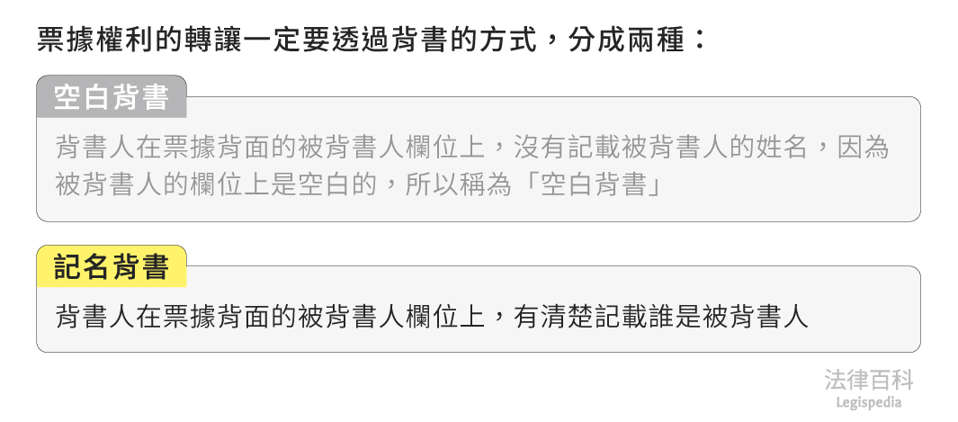 依票據法規定,票據權利的轉讓一定要透過背書的方式[1],而背書的方式有「記名背書」、「空白背書(又稱無記名背書)」兩種[2]。