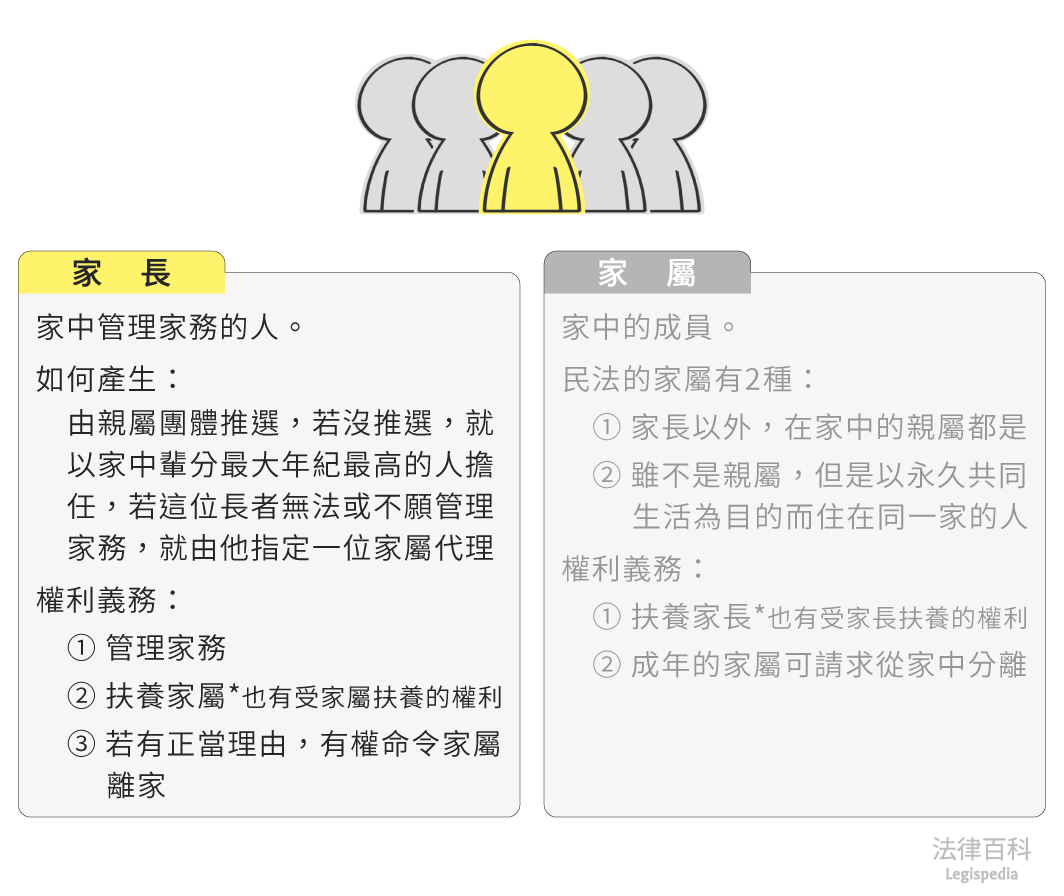 家長是家中管理家務的人[1]。 除了管理家務以外,家長還有扶養家屬的義務,也有受家屬扶養的權利[2];另外如果有正當理由,有權命令家屬離家[3]。