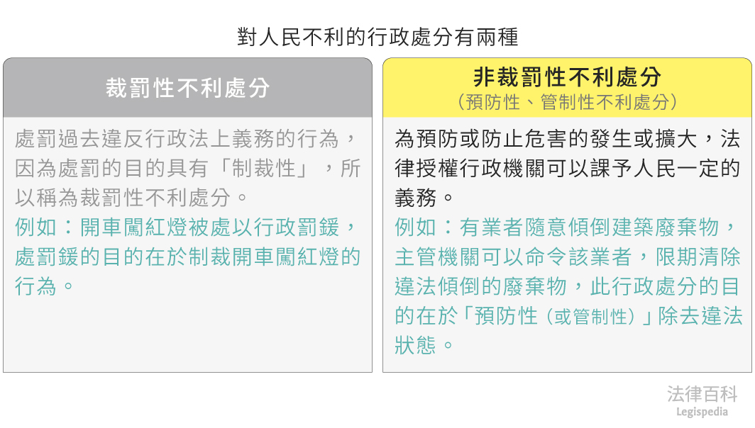 對人民不利的行政處分可以分為「裁罰性不利處分」與「非裁罰性不利處分」兩種類型。