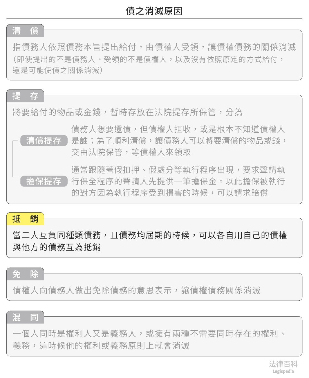 1.   民法第334條第1項:「二人互負債務,而其給付種類相同,並均屆清償期者,各得以其債務,與他方之債務,互為抵銷。」