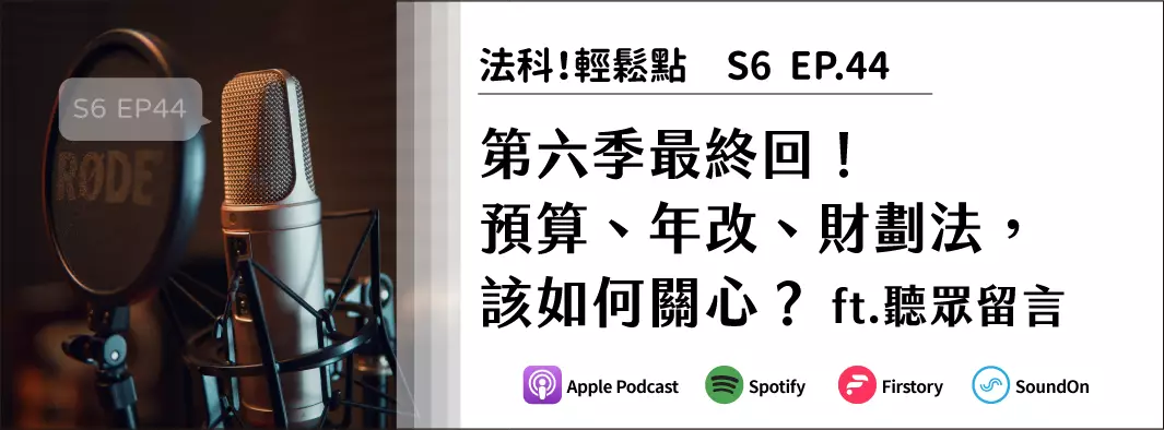 法科!輕鬆點第六季最終篇來囉!感謝各位聽眾朋友對本季節目的收聽、支持與鼓勵,感謝有您陪伴頻道成長,在年假休息之後,我們會努力帶來更多內容給大家喔!本集首先會有聽眾留言時間,由主持人跟聽眾朋友們聊聊天~
