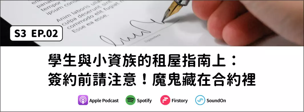暑假慢慢來到尾聲,正要準備開學的同學們或要到外縣市工作社會新鮮人,房子找好了嗎~ 在租屋的需求市場裡,房客容易處於相對弱勢的一端,有時面對房東強硬的態度,就妥協了看似不太合理的要求,事後發生糾紛時,回頭看看當初約定的內容也只好自認倒楣,苦惱著怎麼樣才能跳脫這樣的迴圈。租屋的過程中,除了需要一些運氣,更需要點毅力,在了解彼此的權益後,列出理想中租屋的「不可退讓清單」,或許可以幫助自己離未來理想小窩靠近一些。 從看過陽台隔出馬桶的詭異房型,到面對堅持合約全手抄的房東,同樣身為租屋族的Henry跟Yt,身懷各種看房租屋的經驗,從這些經驗中精煉出許多實用租屋重點,將在這一集中好好分享找房子時實用的法律背景知識,帶你聽明白房東可能不會跟你說的那些事,像是判斷房東真的是房東的小撇步、租非法日租套房可能產生的問題、租約裡哪些項目不能規定等等。租屋新手在掌握這些資訊後,除了爭取自己應有的權利,也可以試著旁敲側擊房東面對這些問題時的處理態度,判斷之後是不是個好溝通的人,在評估房屋狀況、交通便利性或租金價格外,與房東交涉是否順利也是租房時很重要的一環囉!