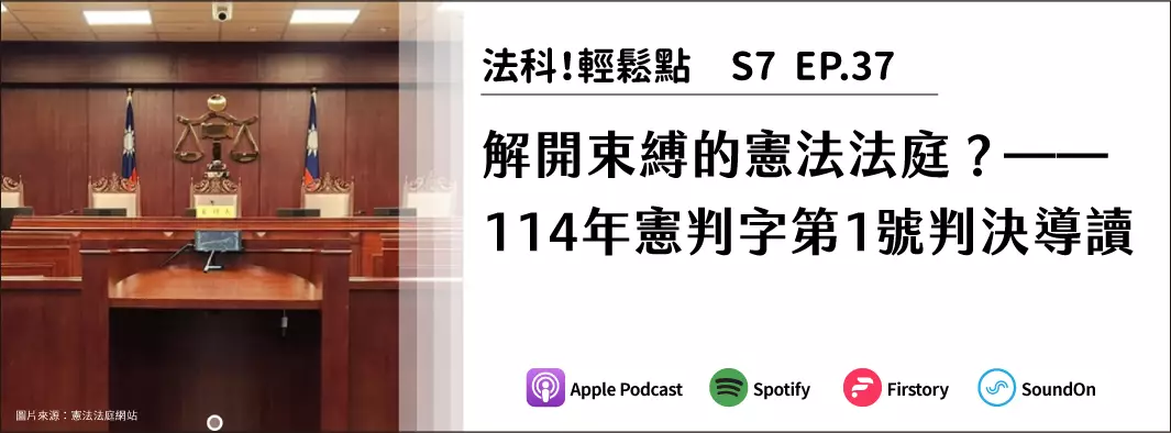 由於此則憲法法庭判決極為重要且具指標性,且各界隨之展開極為激烈的反應與討論,請各位聽眾朋友包涵本集節目緊急插播,由Henry與Jane向大家介紹圍繞憲法訴訟法的各種爭議,以及憲法法庭114憲判字第1號判決涉及的各項爭點,和後續的展望。誠摯邀請大家打開收聽鍵,一起為了憲法時刻而努力。