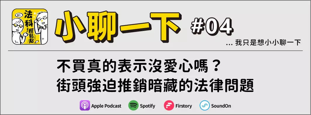 「先生先生,想先跟你說聲謝謝,我們是設計系的學生,為了籌學費這是我做的徽章,你願意貢獻你的愛心,支持我們嗎?」 「哈囉小姐,這個試用包給你,最近生意不好做,進來幫我們做個問卷好嗎?我們的美膚療程都在做優惠喔!」 還記得過去走在商圈或捷運站附近,經常會看到兜售愛心商品或推銷化妝品的人馬,眼神正在搜尋適合的目標準備上前攀談。他們可能會用各種華麗話術半哄半騙得讓你買下你根本不需要的高價商品,從一隻三百塊的自動鉛筆,到價值幾十萬的保養品在新聞中都時有所聞。 遭受他們推銷攻勢的故事,總能成為朋友之間茶餘飯後的話題,但當被這些愛心筆集團、美容業者半路攔截,久久不能脫身,甚至把東西直接塞在自己手上,這類行為到底有沒有問題呢?如果一時腦波弱買下了這些產品,事後到底是不是跟業者說的一樣「不能退貨」呢?希望你聽完這集後可以學到幾個看起來很厲害的法律說法,之後遇到類似的狀況,可以更有底氣的拒絕路邊的強迫推銷員! - 【我們聊了這些】 .00:00-08:20 聽眾們敲碗主題有這些,有興趣的喊+1 .08:21-19:09 強行肉身阻擋逼你買東西的人會犯罪嗎?Henry與西門町拯救紅樓大眼妹的邂逅 .19:10-20:20 那換做使用柔情攻勢賣愛心筆,還會有法律責任嗎? .20:21-22:57 不只是愛心筆,路邊推銷化妝品的漂亮姐姐其實很危險? .22:58-29:17 我只是為了要擺脫你啊~萬一真的買了可不可以退貨呢? - 【聽完還想更了解,你還可以用看的】 .你愛,我不愛—強迫推銷愛心筆會有哪些法律問題?︱作者:黃博聖 .法律百科問答(2020),《賣愛心筆的人不讓我離開,合法嗎?萬一被強塞愛心筆可以退貨嗎?》 .什麼是七日鑑賞期?哪些例外情況不適用七日鑑賞期?︱作者:李昕