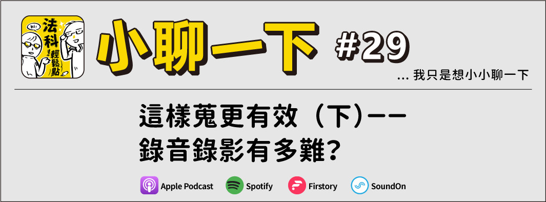 本次預計推出上下兩集蒐證系列,跟聽眾朋友聊聊關於蒐證的各種疑難雜症,在下集節目中,主持人Yt與Henry將延續實務上蒐證的難題,分別討論錄影、錄音的各種情境,說明單純使用影像當證據,或是把影像放到網路上,其中的差別是什麼,以及在試圖錄下他人私下對話時需要注意的情境。蒐證學問多,快打開節目按下收聽鍵,讓我們一起來參詳!