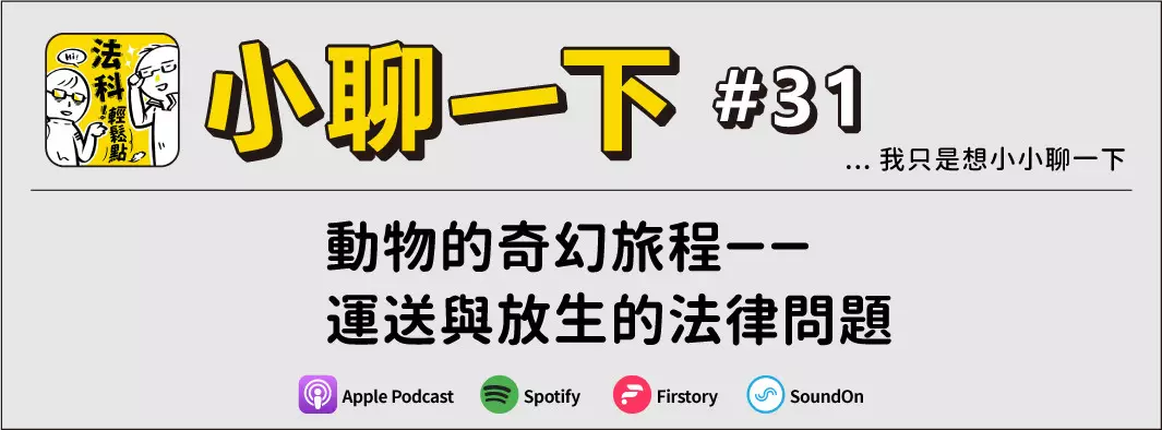 【我們聊了這些】 .00:18 放生是愛還是不愛?那些放生引發的爭議 .16:38 讓動物奔向大自然錯在哪?談管制放生的法律規定 .24:04 放與不放之間?法律如何調和生態與宗教? .30:44 運送動物也要小心駕駛!談動物運送的法律問題